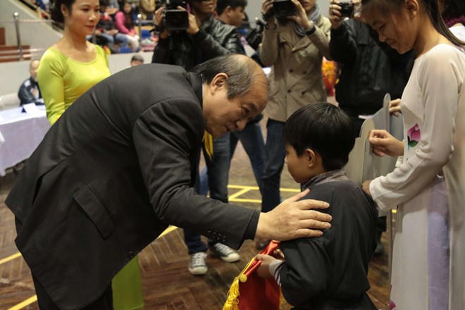 | Tổng cục trưởng Tổng cục Thể dục, Thể thao Vương Bích Thắng thăm hỏi một vận động viên nhí. (Ảnh: Ban tổ chức cung cấp)