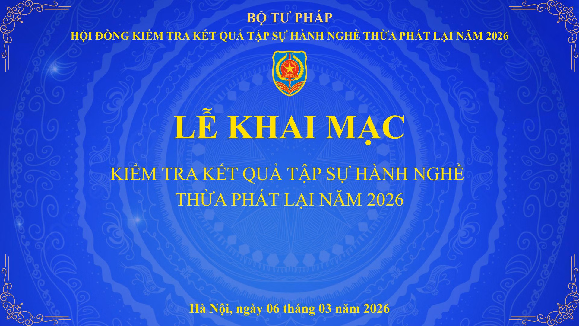 (PLVN) - Thực hiện Kế hoạch của Bộ Tư pháp về tổ chức kiểm tra kết quả tập sự hành nghề Thừa phát lại năm 2026 (ban hành kèm theo Quyết định số 415/QĐ-QĐ-HĐKT ngày 28/01/2026 của Hội đồng kiểm tra), chiều 06/03/2026, Bộ Tư pháp đã long trọng tổ chức Lễ khai mạc Kỳ kiểm tra kết quả tập sự hành nghề Thừa phát lại.