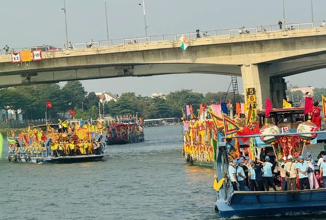 Phà chở đoàn nghinh thần và khách trên sông Đồng Nai trong lễ nghinh thần thuộc Lễ hội chùa Ông. |