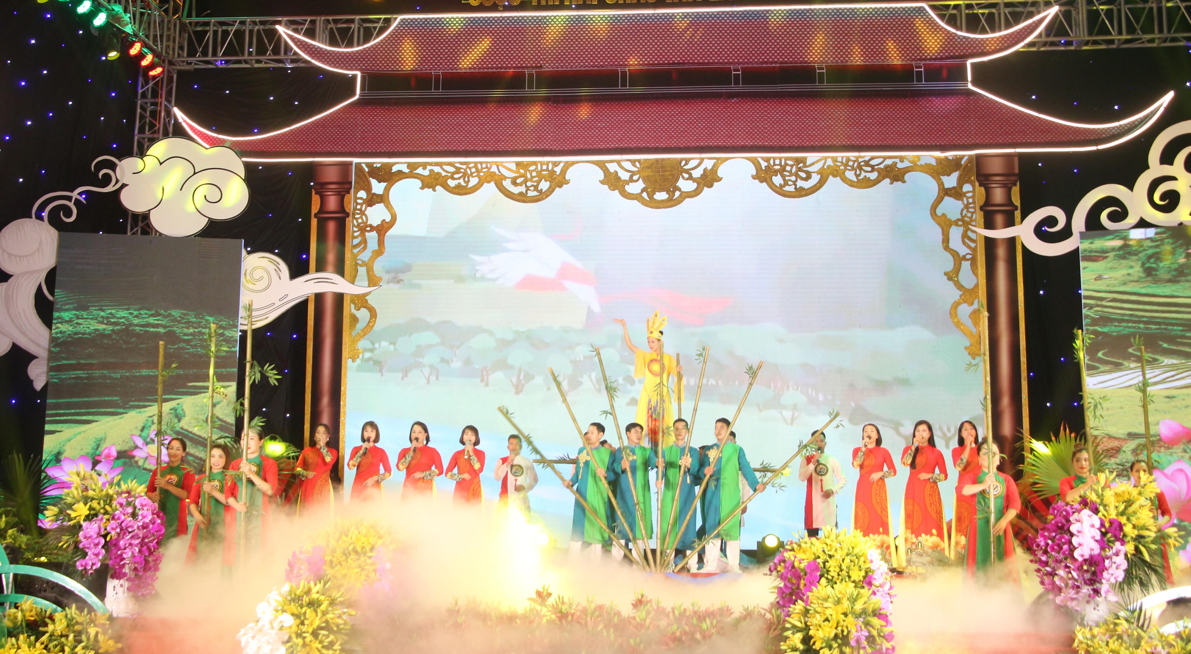 Tiết mục văn nghệ mở màn cho đêm khai mạc lễ hội đền Đông Cuông. |
