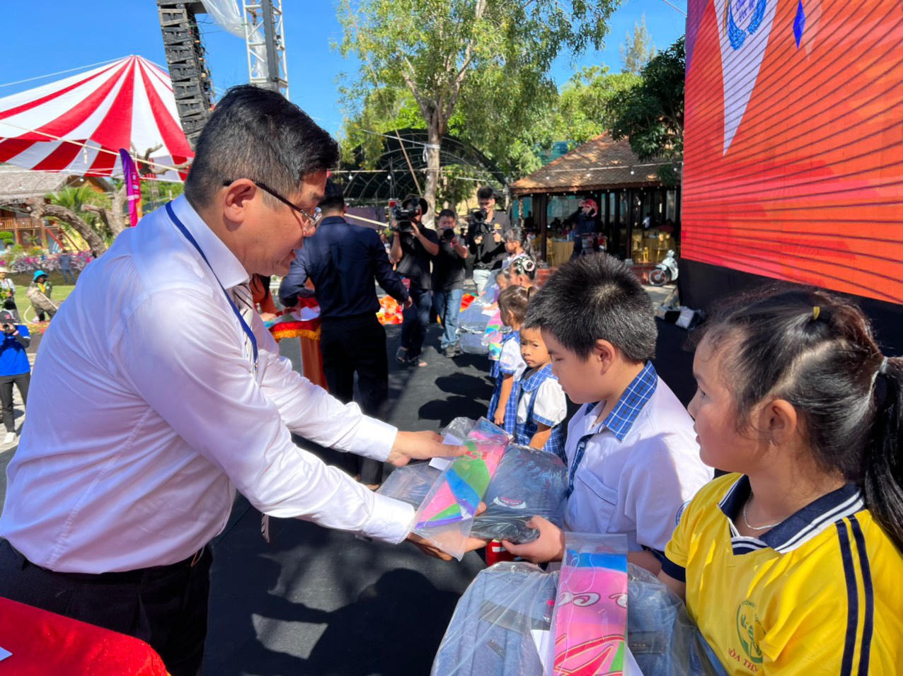 Đại diện chính quyền địa phương và nhà tài trợ trao tượng trưng quà cho các học sinh nghèo tỉnh Bình Thuận |