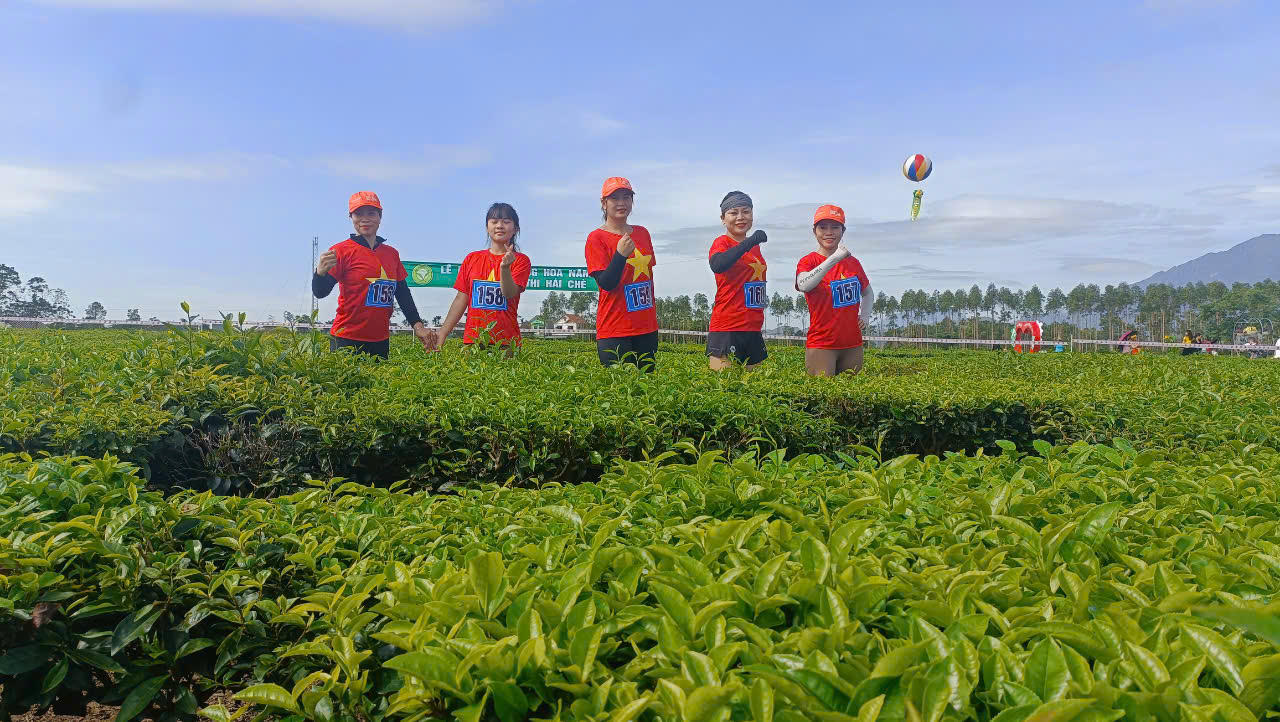 Các Cua-rơ của Giải đua xe đạp trải nghiệm khám phá đồi chè và hồ Trúc Bài Sơn check in tại đồi chè |