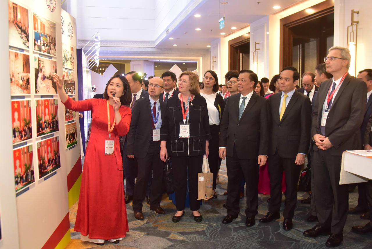 Các bức ảnh cũng giới thiệu các mốc thời gian hợp tác quan hệ giữa hai quốc gia. Năm 2005, Tổng Bí thư Nông Đức Mạnh có chuyến công du sang thăm và làm việc với Pháp.