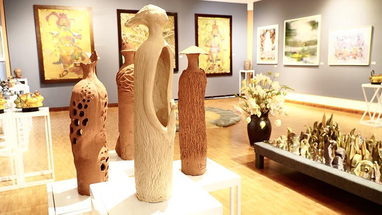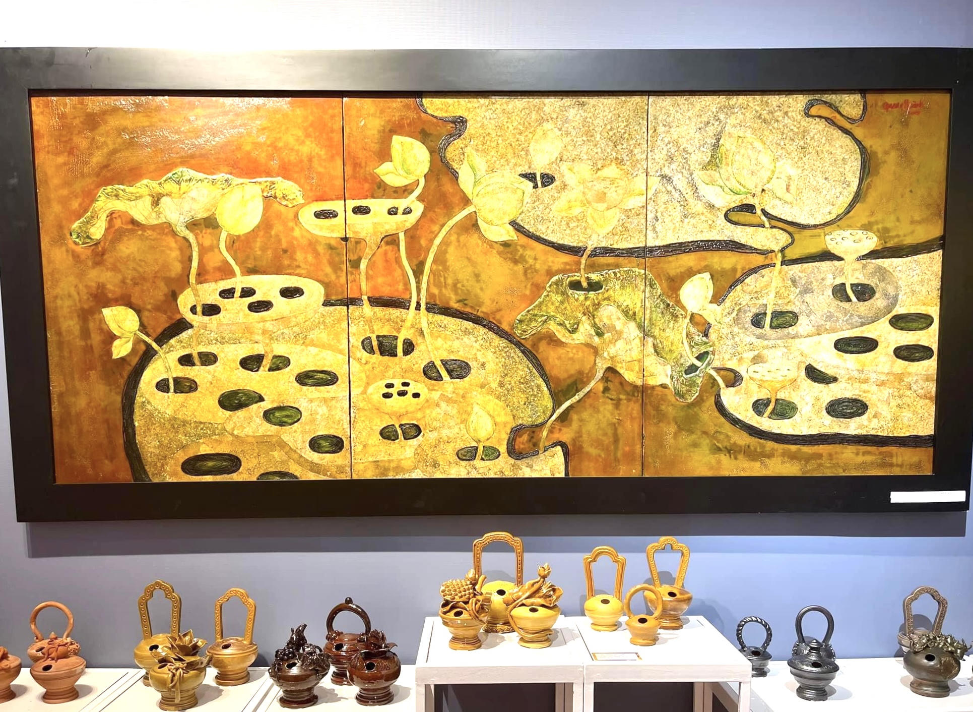 Bên cạnh những bức tranh về sen, triển lãm còn trưng bày nhiều tác phẩm được làm từ lụa tổng hợp, lụa truyền thống. Đặc biệt các tác phẩm được làm bằng chất liệu gốm thanh lưu ly, loại lưu ly hoàng gia sử dụng trong cung đình Huế được lưu giữ, kế thừa cho đến bây giờ.