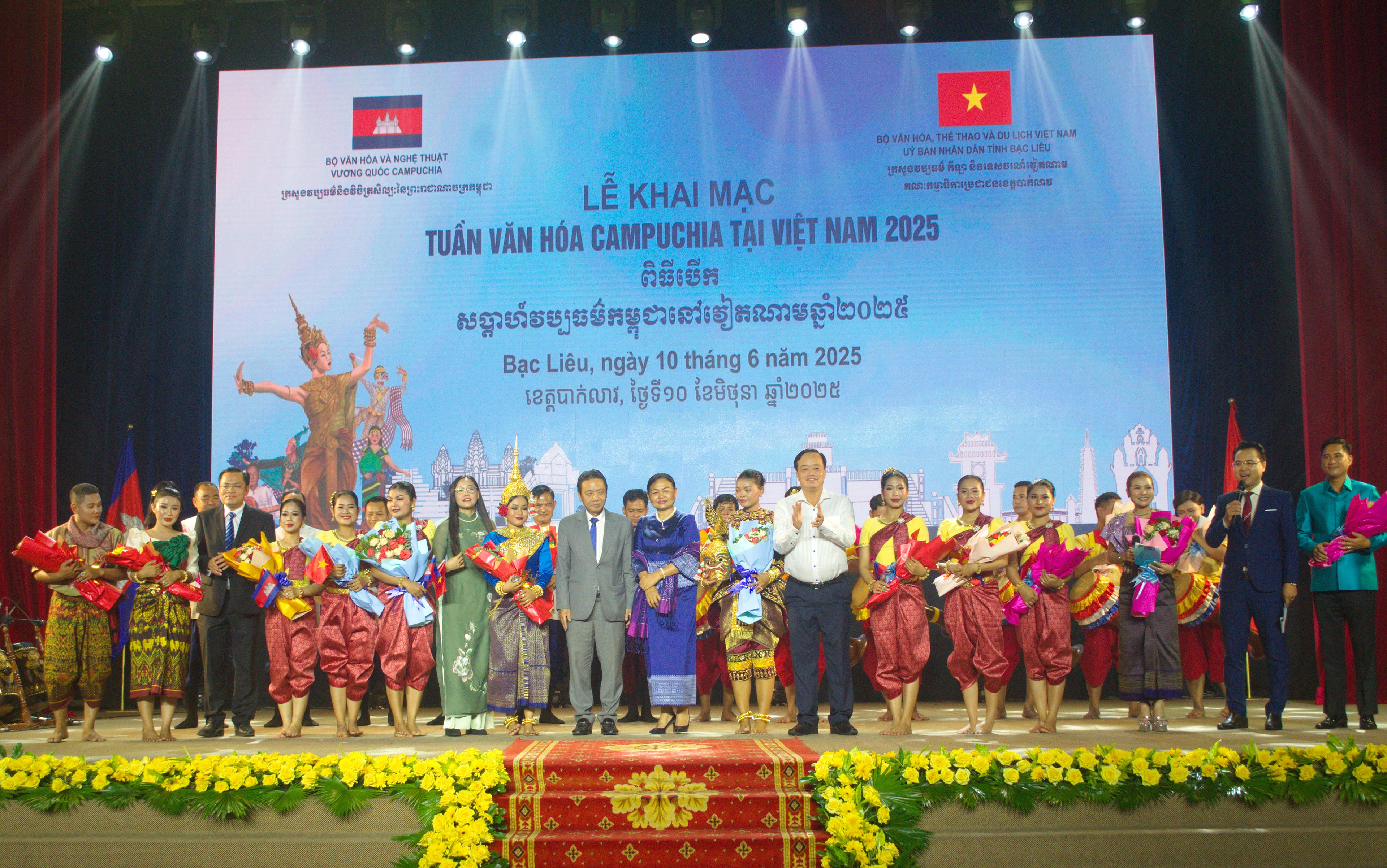 Lãnh đạo Bộ Văn hóa, Thể thao và Du lịch, Bộ Văn hóa và Nghệ thuật Campuchia và tỉnh Bạc Liêu, tặng hoa cho các các nghệ sĩ, diễn viên, nhạc công… của Campuchia. |