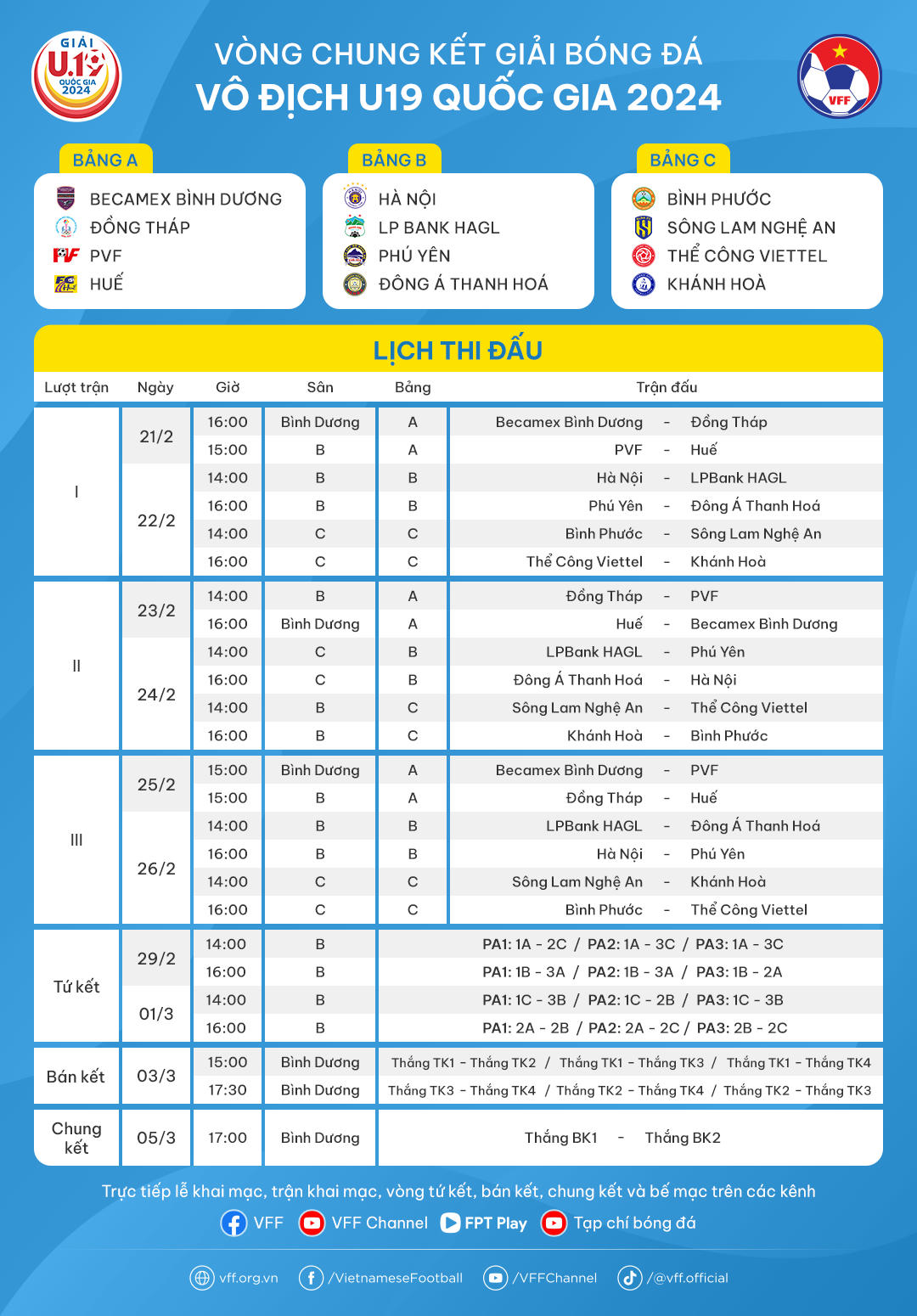 LỊCH THI ĐẤU VCK GIẢI BÓNG ĐÁ VÔ ĐỊCH U19 QUỐC GIA 2024