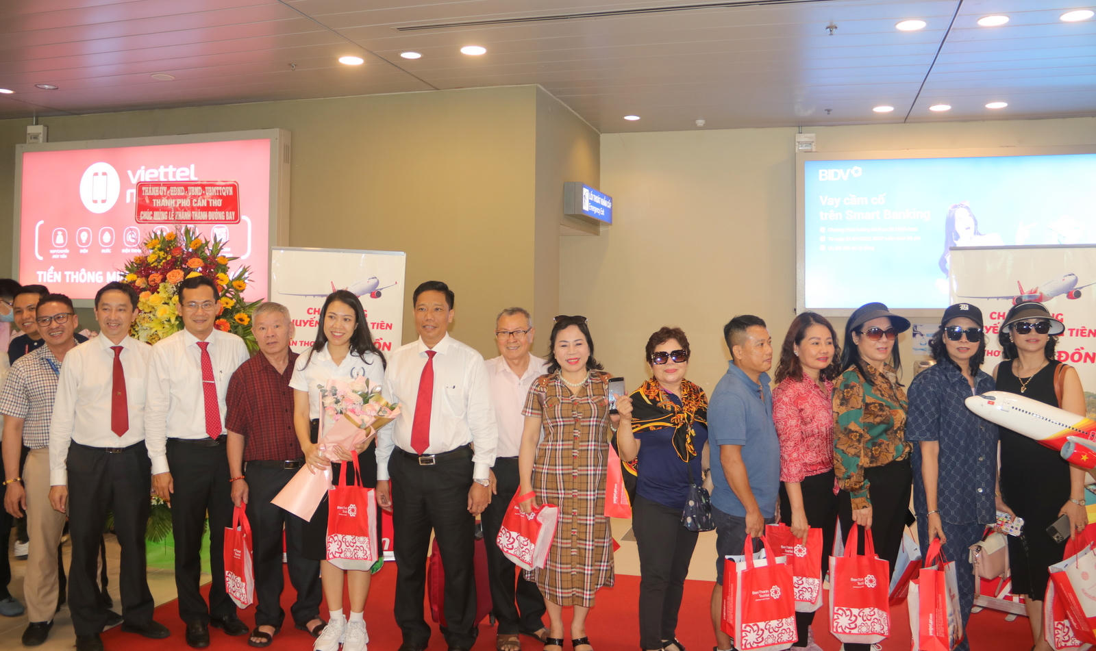 Hành khách trên chuyến bay đầu tiên chụp hình lưu niệm với lãnh đạo TP Cần Thơ |