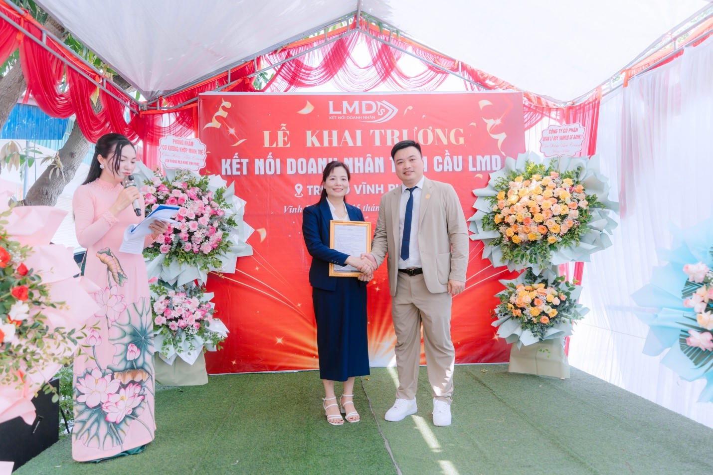 Ngay sau lễ phát biểu, Ban lãnh đạo Tổ chức Kết nối Doanh nhân Toàn cầu LMD đã trao quyết định thành lập Văn phòng đại diện cho bà Nguyễn Thị Minh Thuận, Giám đốc Văn phòng tại Vĩnh Phúc. Nghi thức cắt băng khai trương diễn ra trong không khí trang trọng, chính thức đưa Văn phòng vào hoạt động với sứ mệnh trở thành cầu nối giữa doanh nghiệp và người dân địa phương.