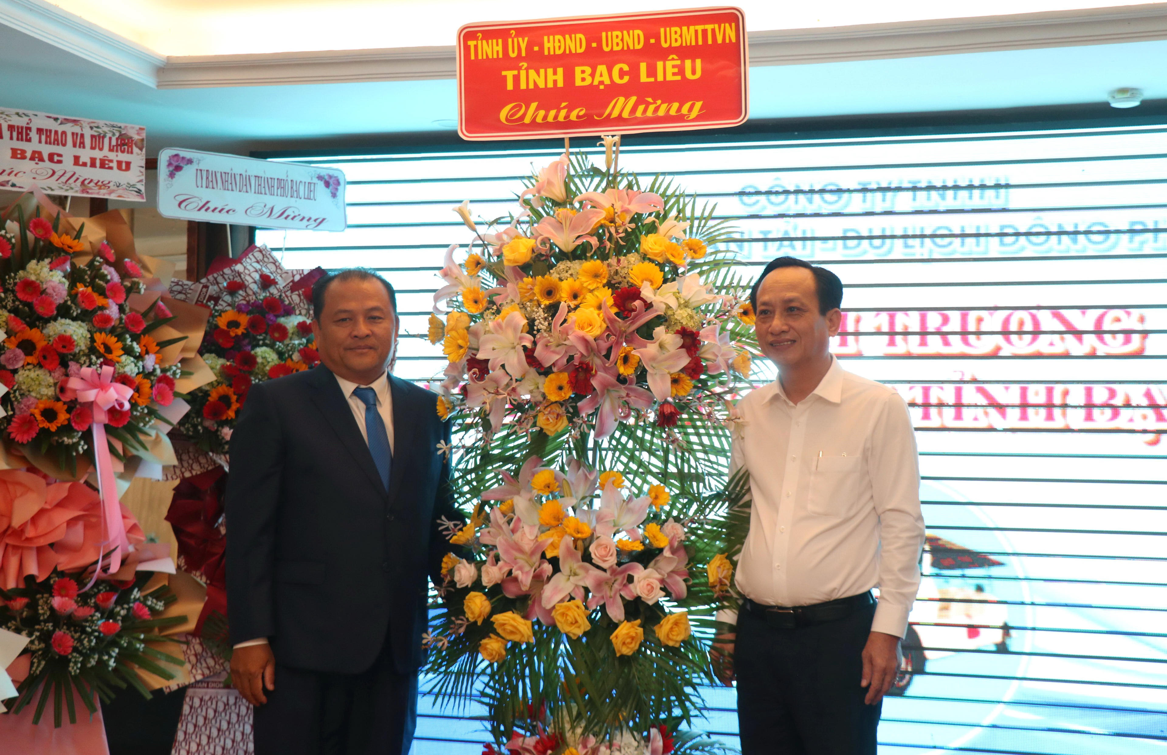 Ông Phạm Văn Thiều – Phó Bí thư Tỉnh ủy, Chủ tịch UBND tỉnh Bạc Liêu (bên phải) tặng hoa chúc mừng lãnh đạo Công ty TNHH Dịch vụ - Vận tải - Du lịch Đông Phong. |