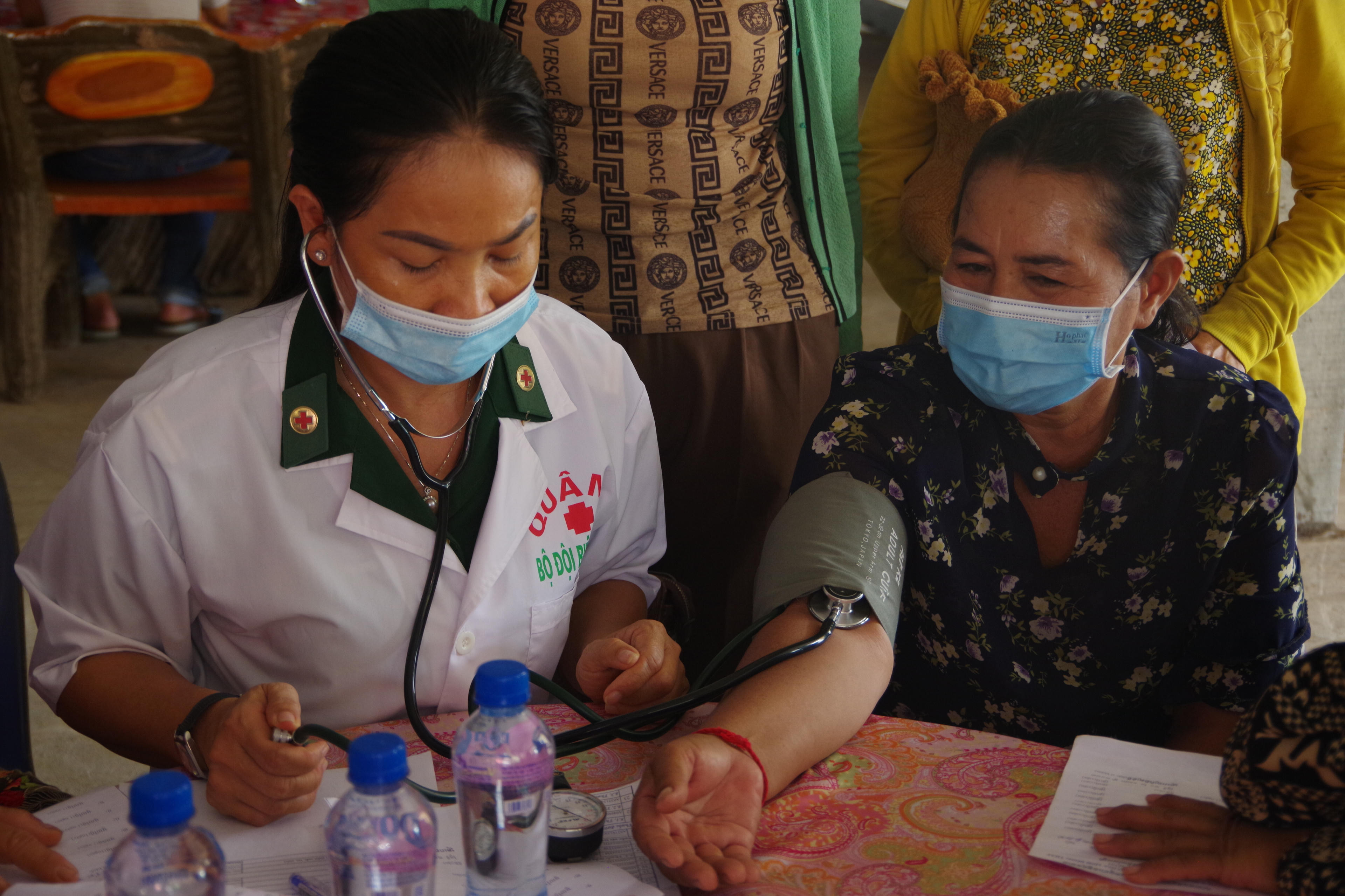 Quân y BĐBP Đồng Tháp khám bệnh cho người dân xã Piềm Rô, huyện Piềm Rô, tỉnh Prâyveng (Campuchia). Ảnh: Mạnh Cường |