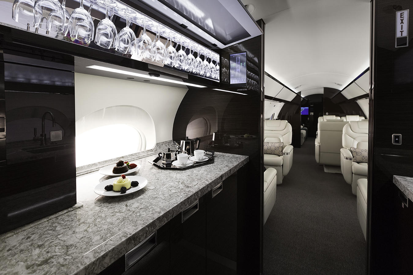 Bàn ghế tuỳ chỉnh để có thể sẵn sàng cho bất cứ cuộc họp hay bữa tiệc rượu vang nào cho các doanh nhân. Một quầy bếp sẵn sàng cho các chủ nhân của Gulfstream G650ER tận hưởng cuộc sống như ở dưới mặt đất. Mọi tiện nghi đều được “đo ni đóng giầy” với các chất liệu cao cấp.