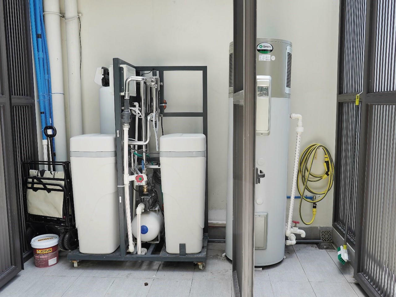(Hệ thống máy lọc nước đầu nguồn và máy nước nóng A .O. Smith được đặt gọn gàng ở ban công) |