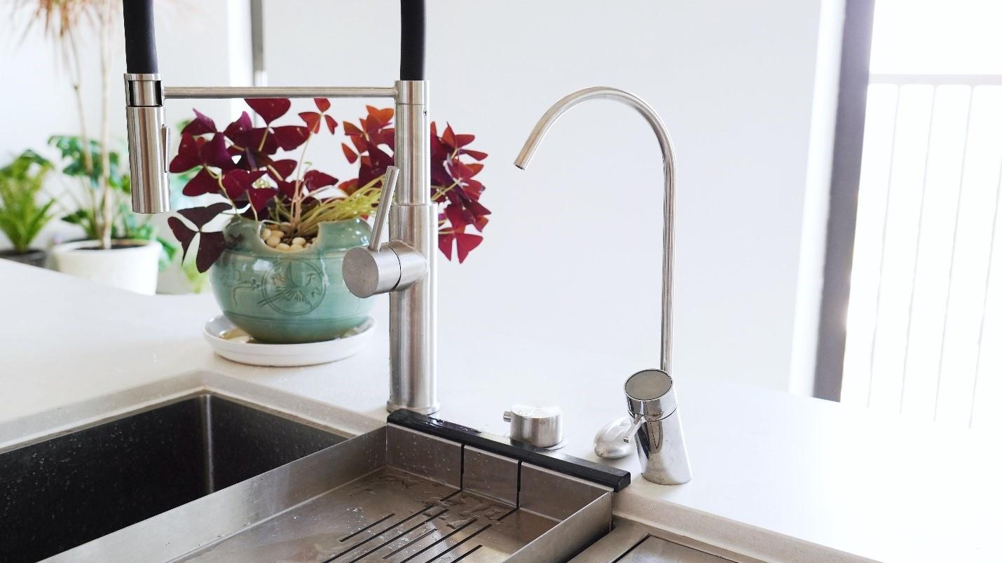 (Máy lọc nước R400S siêu nhỏ gọn được giấu khéo dưới ngăn tủ, vòi nước được lắp cạnh His & Her sink) |