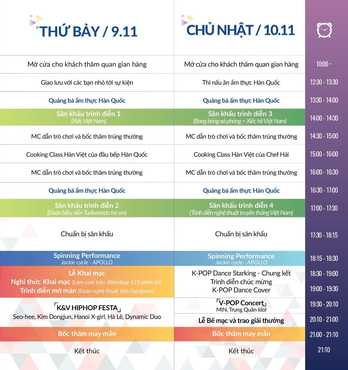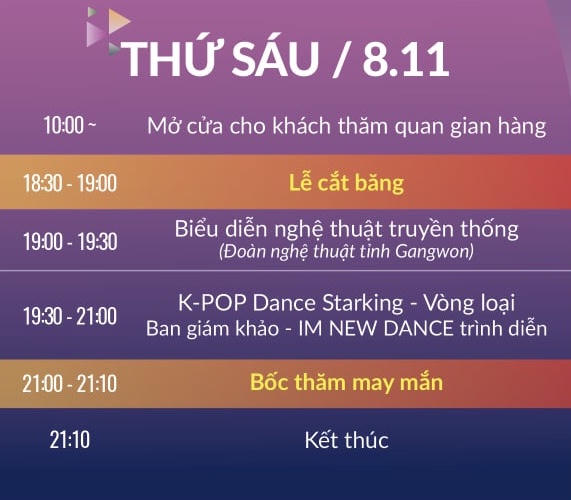 Lễ hội năm nay còn có sự tham gia của các nghệ sĩ nổi tiếng như Hà Lê, Min, Dynamic Duo, Trung Quân Idol... Ngoài ra, các chương trình sôi động và bổ ích: đấu võ Taekwondo mẫu Việt Nam- Hàn Quốc, phần công diễn của đoàn nghệ thuật tỉnh Kang Won, bốc thăm trúng thưởng cũng là điểm nhấn của sự kiện lần này. Dưới đây là lịch trình cụ thể cho hai ngày cuối tuần tiếp theo.