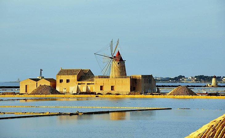 Đặc biệt rất nhiều người tìm đến Trapani chỉ để ngắm nhìn những chiếc cánh quạt cối xay gió in bóng trên nền hoàng hôn màu cam trong khung cảnh đồng muối rộng mênh mông đầy nắng gió.