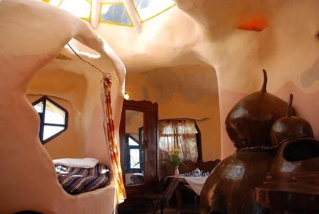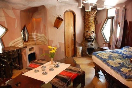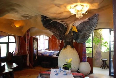 Bước chân vào căn nhà, du khách có cảm giác như đặt chân tới khu rừng của thế giới cổ tích với cây cối chằng chịt. Quanh nhà là những cây nấm khổng lồ đúc bằng bê tông. Từ trần tới mái nhà không thiết kế theo quy luật nào, thoải mái uốn lượn theo hình thù kỳ lạ, chỗ lồi chỗ lõm tạo cảm giác kỳ bí.