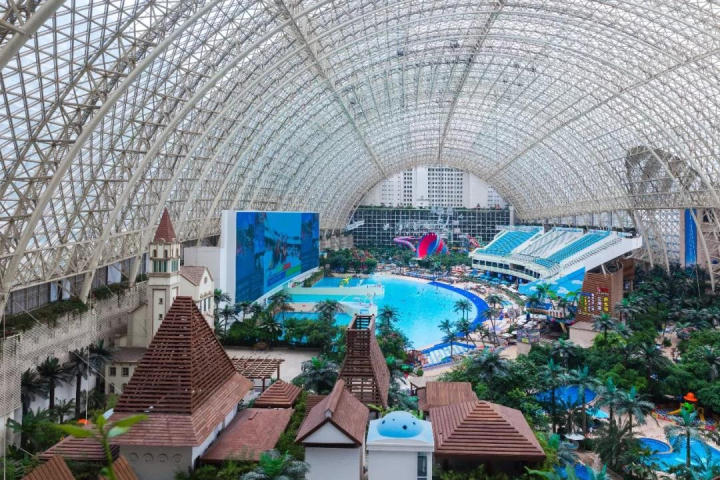 Bãi biển trong toà nhà có thể tạo ra những cơn sóng mạnh và được trang bị một màn hình LED lớn để tạo ra khung cảnh bình minh và hoàng hôn. |