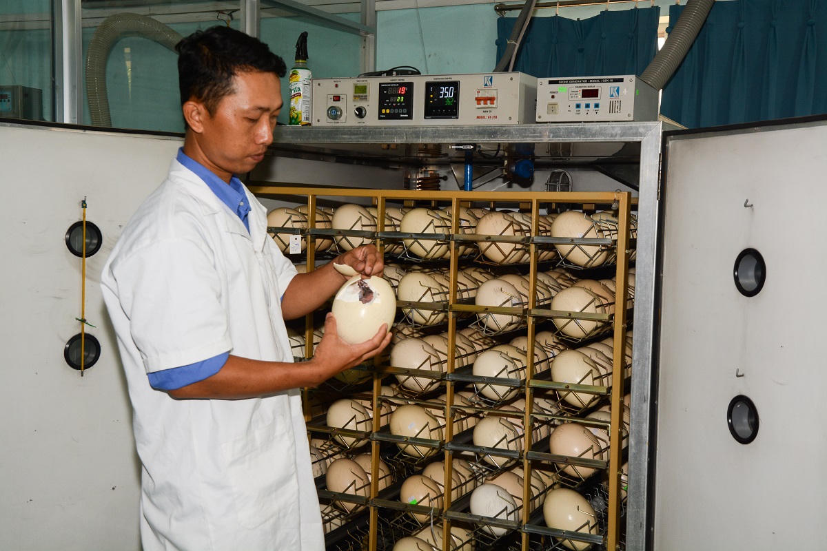 Hàng ngày, trứng đà điểu được công nhân đỡ đẻ hoặc thu lượm được ghi thông tin về ô chuồng, con bố mẹ, ngày đẻ… sau đó được phân loại, khử trùng rồi đưa vào máy ấp. Những quả trứng không đủ tiêu chuẩn ấp được dùng làm thực phẩm, vỏ trứng dùng chế tác đồ mỹ nghệ.