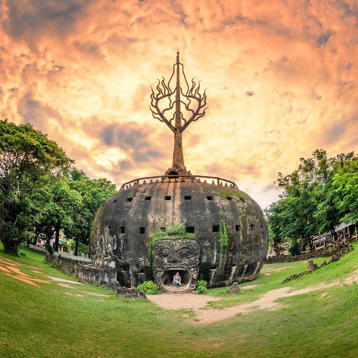 Ngay từ cổng vào, du khách sẽ bị ấn tượng bởi kiến trúc độc đáo của Lào, với chùa tháp có nhiều tầng mái, chóp mái cao, và hình tượng rắn thần Naga ở đầu mái, linh vật truyền thuyết của người Lào. Giữa vườn, tượng Phật nhập Niết Bàn với chiều dài hơn 40 mét nổi bật, cùng với Tháp bí ngô độc đáo và các tác phẩm khác như thần Indra cưỡi trên lưng voi ba đầu.