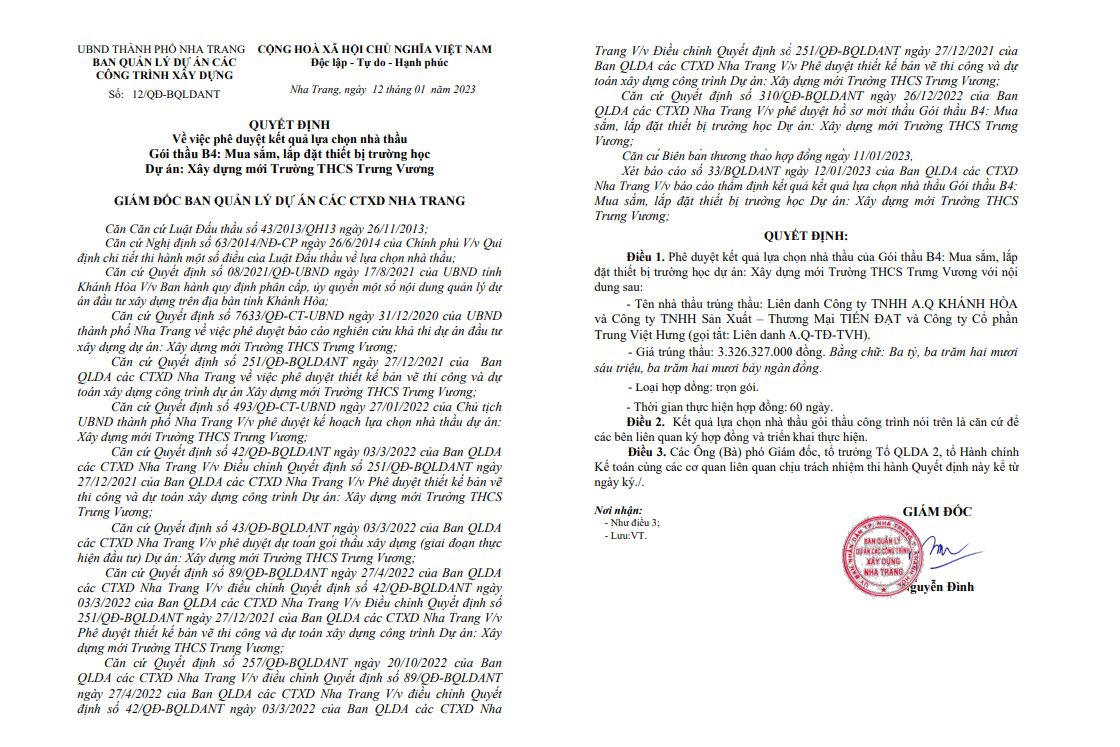 Quyết định phê duyệt kết quả lựa chọn nhà thầu cho Liên danh Công ty TNHH A.Q Khánh Hòa, Công ty TNHH Sản Xuất – Thương Mại Tiến Đạt và Công ty Cổ phần Trung Việt Hưng. |