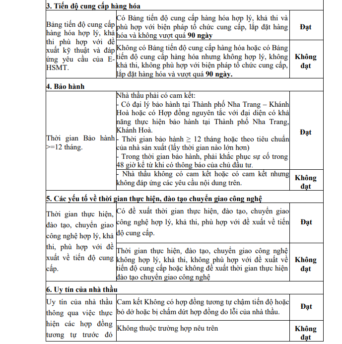 Cũng tại gói thầu nêu trên, tại Chương III tiêu chuẩn đánh giá hồ sơ dự thầu, chủ đầu tư lại đưa ra yêu cầu nhà thầu phải có cam kết có đại lý bảo hành tại TP Nha Trang – Khánh Hòa hoặc có hợp đồng nguyên tắc với đại diện có khả năng thực hiện bảo hành tại TP Nha Trang – Khánh Hòa.