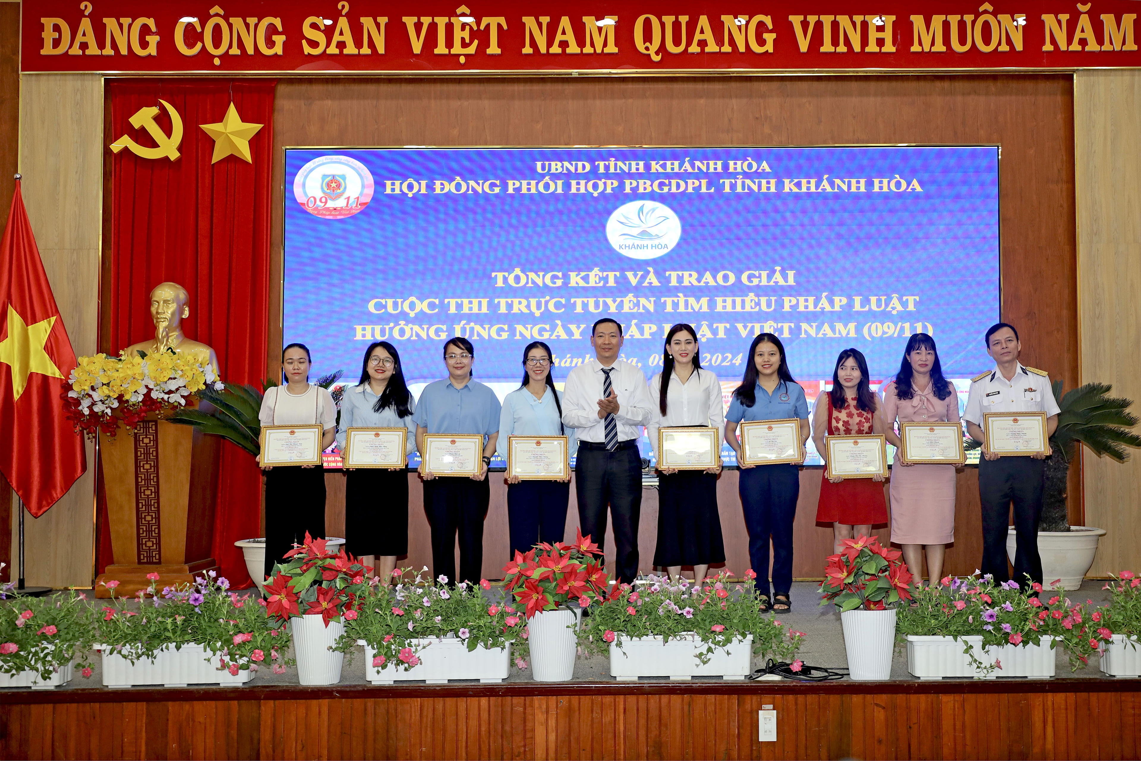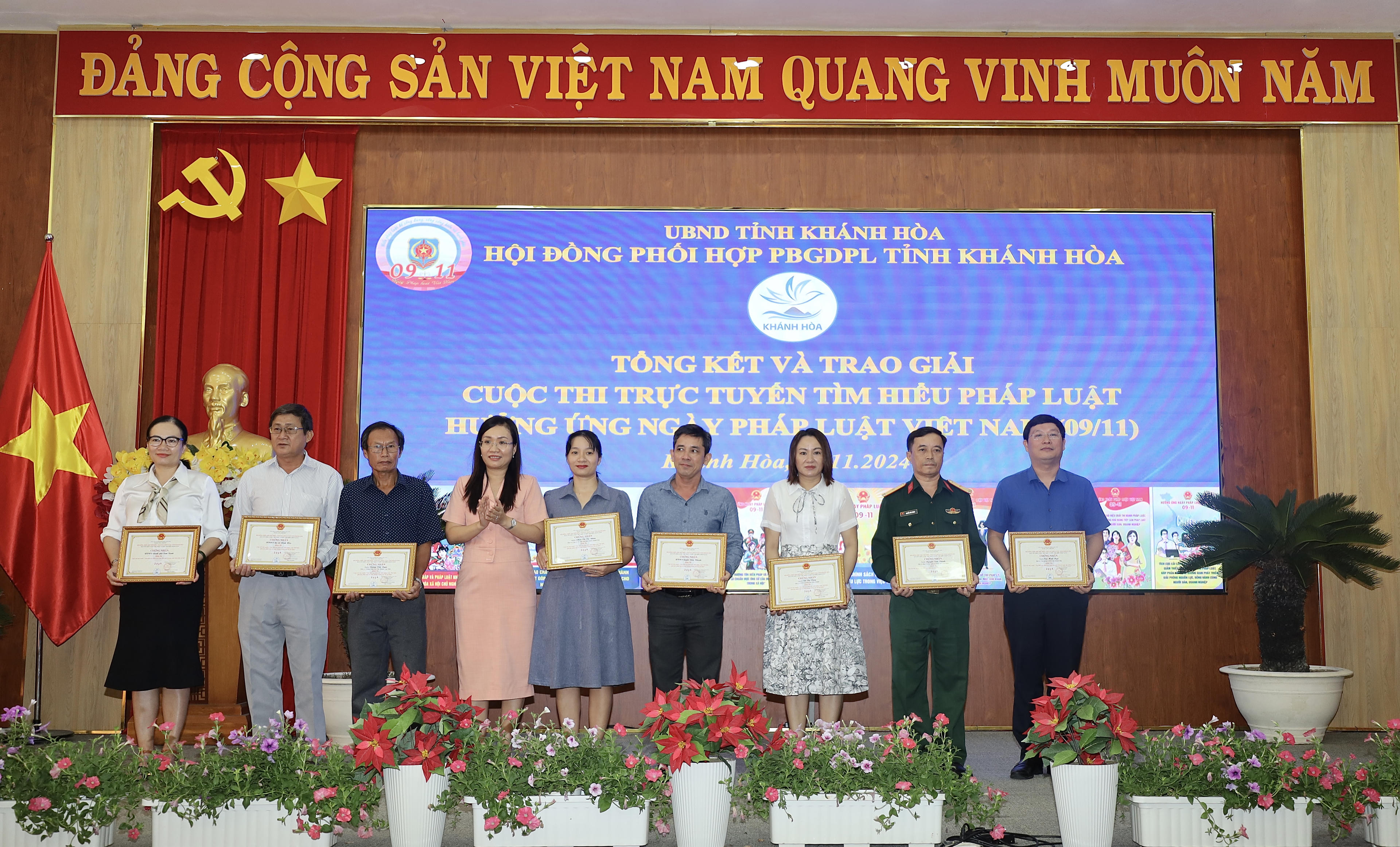 (PLVN) - Sáng ngày 8/11, Hội đồng Phối hợp phổ biến, giáo dục pháp luật (PBGDPL) tỉnh Khánh Hòa đã tổ chức lễ tổng kết và trao giải cho các cá nhân có thành tích xuất sắc trong 2 cuộc thi trực tuyến tìm hiểu pháp luật trên địa bàn.