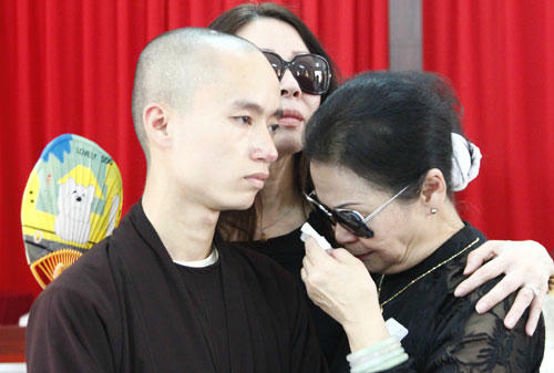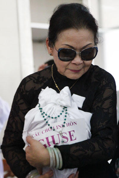 Trong lễ cúng 100 ngày của ông Nguyễn Hoàng Đoan sáng 19/4, Khánh Ly ôm chặt tro cốt chồng, không kiềm được nước mắt.