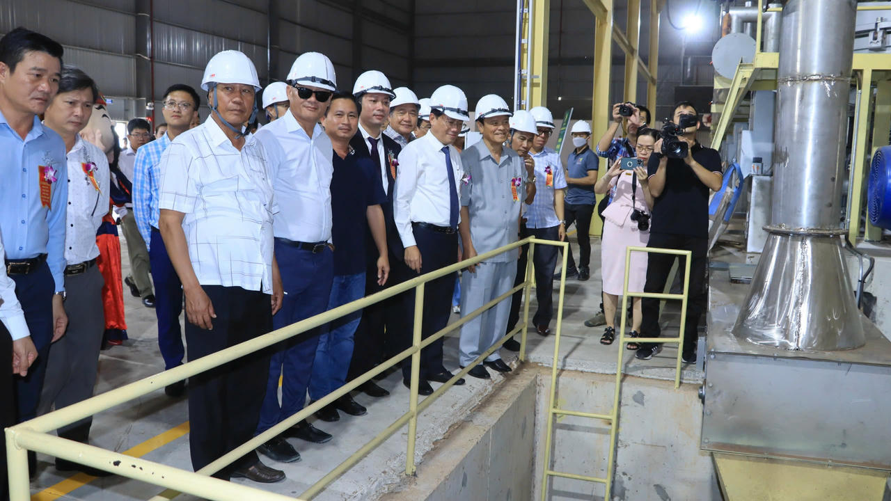 Chủ tịch UBND tỉnh Phạm Anh Tuấn cùng đại biểu tham quan dây chuyền vận hành sản xuất của nhà máy. |
