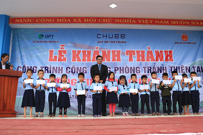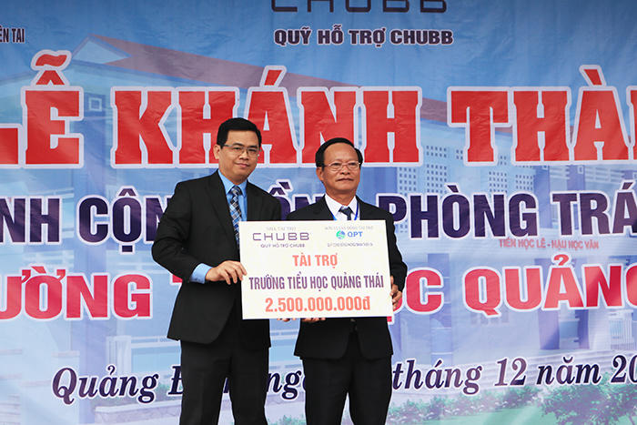 Cũng nhân dịp này, Công ty TNHH Bảo hiểm Nhân thọ Chubb Việt Nam đã tặng 50 suất học bổng (mỗi suất 500.000đ) cho các em học sinh nghèo hiếu học tại trường tiểu học Quảng Thái và trang bị kệ sách, sách tham khảo cho thư viện nhà trường.