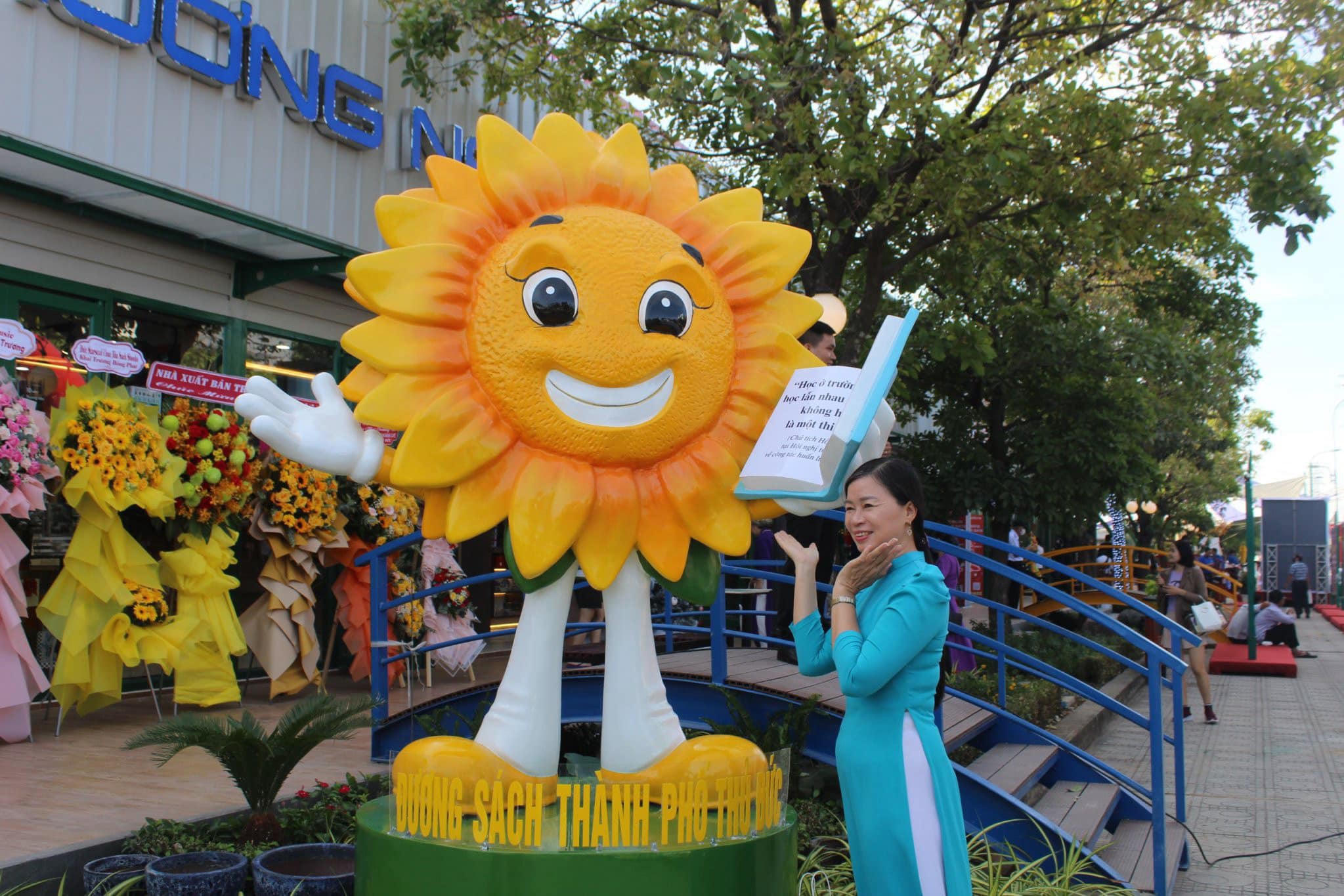 Đầu đường sách là linh vật hoa hướng dương - biểu tượng thân thiện của TP Thủ Đức để làm nhận diện thương hiệu. Bên trong còn có 2 phiến đá khắc tiểu sử Mẹ Việt Nam anh hùng Hồ Thị Tư và câu nói của Chủ tịch Hồ Chí Minh về văn hóa đọc.