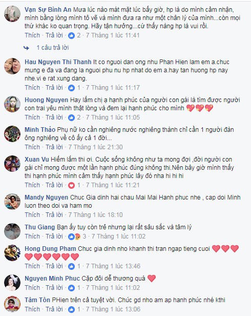 Theo chia sẻ của Khánh Thi, hạnh phúc lớn nhất trong đời người con gái chính là việc tìm được một người con trai yêu cô tha thiết và sẵn sàng chia sẻ mọi chuyện chứ không phải là một người giàu có nào khác. Và quan điểm này của bà mẹ một con đã nhanh chóng thu hút sự quan tâm từ phía cộng đồng mạng. Rất nhiều người ngưỡng mộ tình cảm của hai người và cho rằng, Phan Hiển chính là một người đàn ông tốt, hết lòng vì Khánh Thi và gia đình nhỏ.