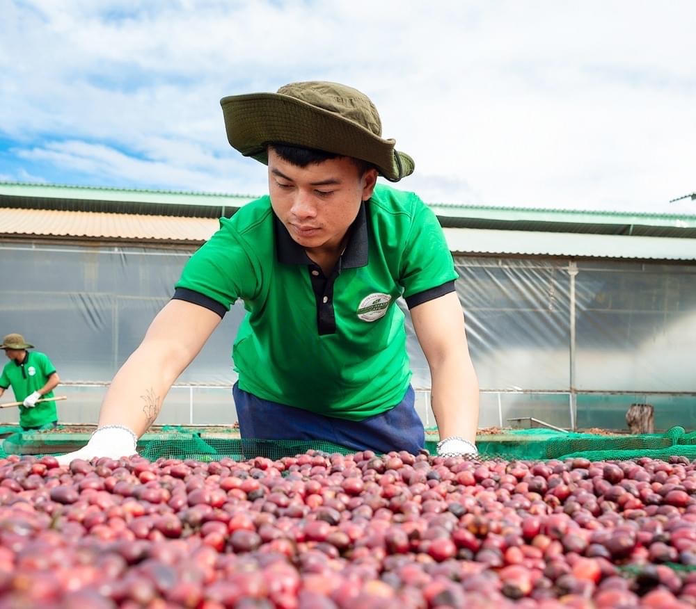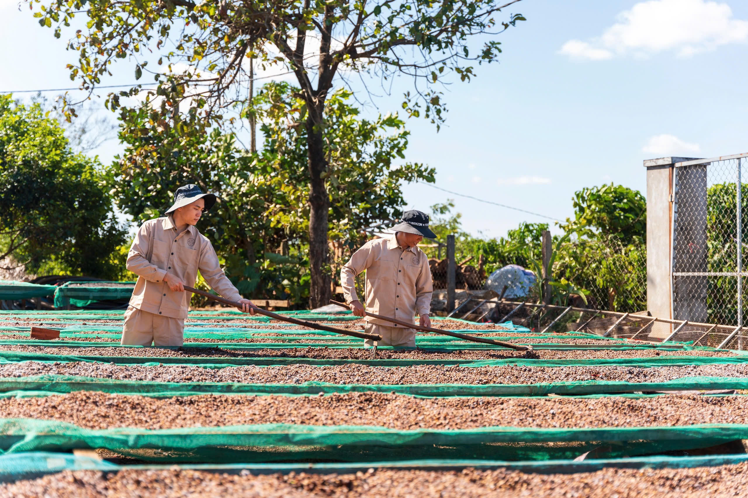 Nhân viên phơi cà phê sau khi tuyển chọn. |