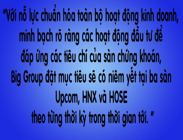 Với nỗ lực chuẩn hóa toàn bộ hoạt động kinh doanh, minh bạch rõ ràng các hoạt động đầu tư để đáp ứng các tiêu chí của sàn chứng khoán, Big Group đặt mục tiêu sẽ có niêm yết tại ba sàn Upcom, HNX và HOSE theo từng thời kỳ trong thời gian tới.