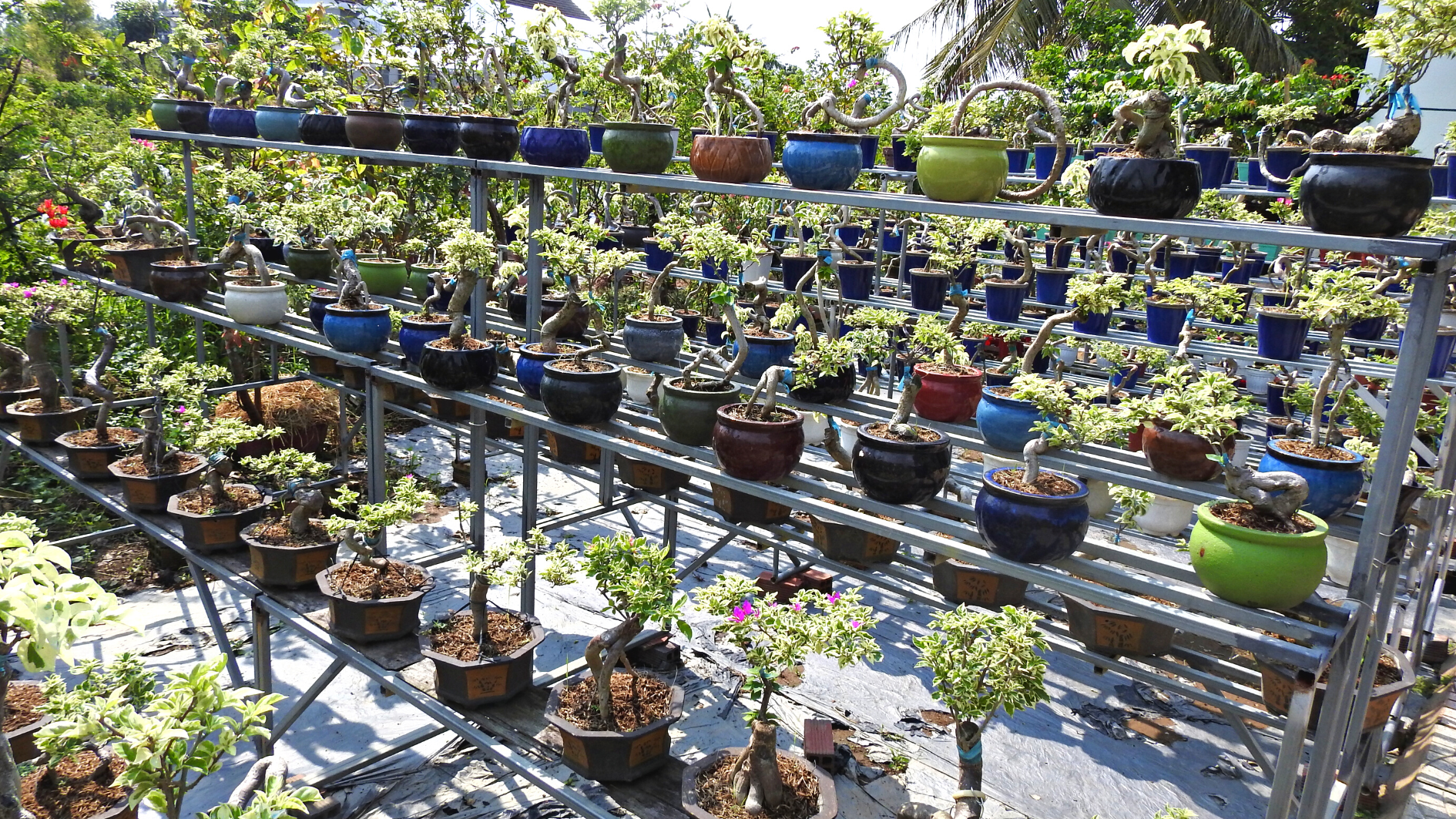 Bon sai hoa giấy được phối nhiều màu sắc với nhiều hình thù đa dạng tại thủ phủ hoa kiểng Chợ Lách rất hút khách trong những dịp Tết gần đây |