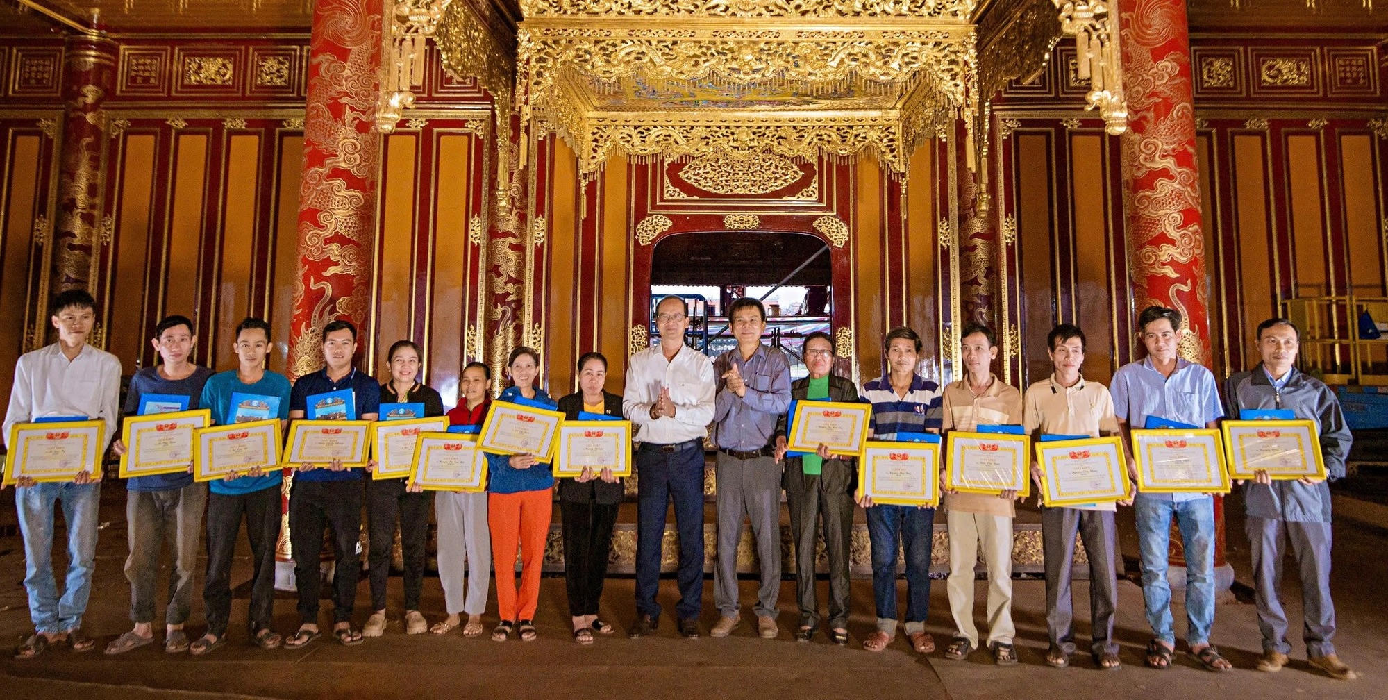 Theo đó, tại công trình tu bổ di tích điện Thái Hòa, ông Hoàng Việt Trung - Giám đốc Trung tâm Bảo tồn Di tích Cố đô Huế đã trao Giấy khen cho 14 nghệ nhân và thợ lành nghề. Đây là sự ghi nhận những đóng góp, tâm huyết của những nghệ nhân trong công tác bảo tồn di tích.