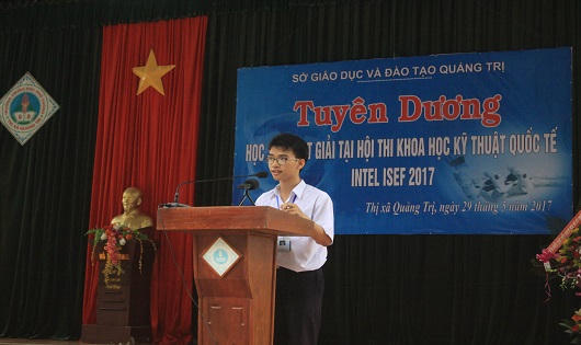 (PLO) - Ngày 29/5, Sở GD&ĐT tỉnh Quảng Trị tổ chức tuyên dương, khen thưởng cho em Phạm Huy (học sinh lớp 11, Trường THPT thị xã Quảng Trị) đã đạt giải ba tại Cuộc thi Khoa học kỹ thuật Quốc tế 2017 (Intel ISEF) với sản phẩm Cánh tay robot dành cho người khuyết tật.