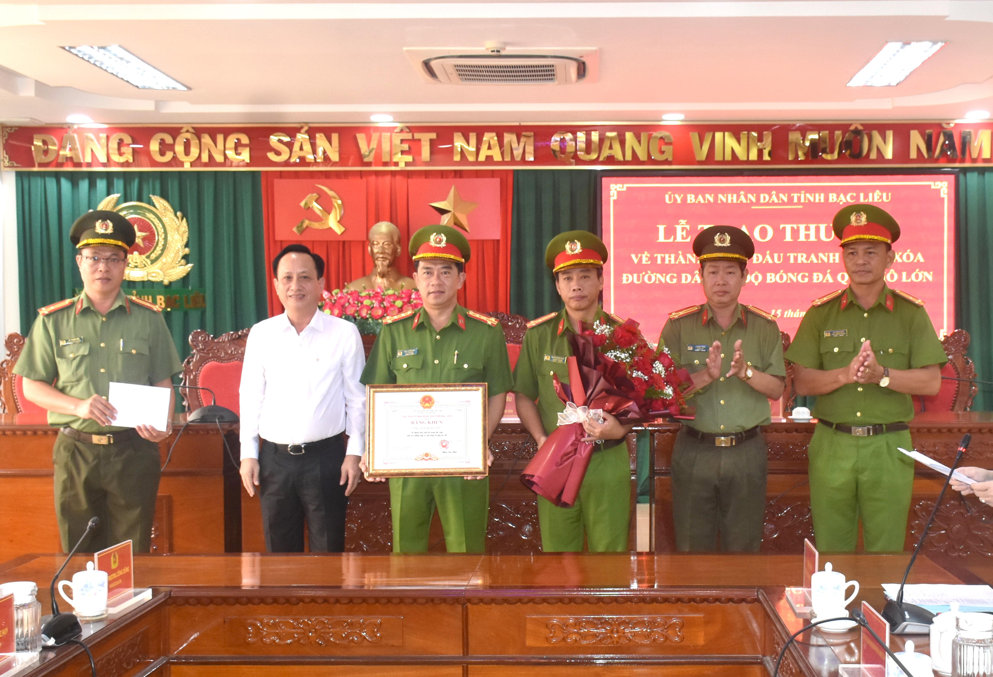 Chủ tịch UBND tỉnh Bạc Liêu đã ra Quyết định khen thưởng đột xuất với số tiền 10 triệu đồng đối với Công an tỉnh Bạc Liêu và 5 cá nhân có thành tích xuất sắc trong tấn công triệt xóa đường dây cá cược bóng đá quy mô lớn.