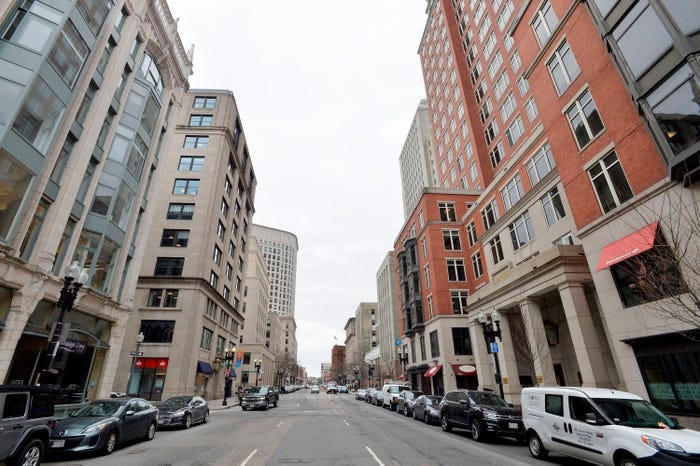 Khu tài chính của thành phố Boston vô cùng yên tĩnh. Tất cả các trường học ở Boston đều đóng cửa, và Thống đốc Charlie Baker của Massachusetts đã giới hạn các cuộc tụ họp công cộng không quá 25 người.