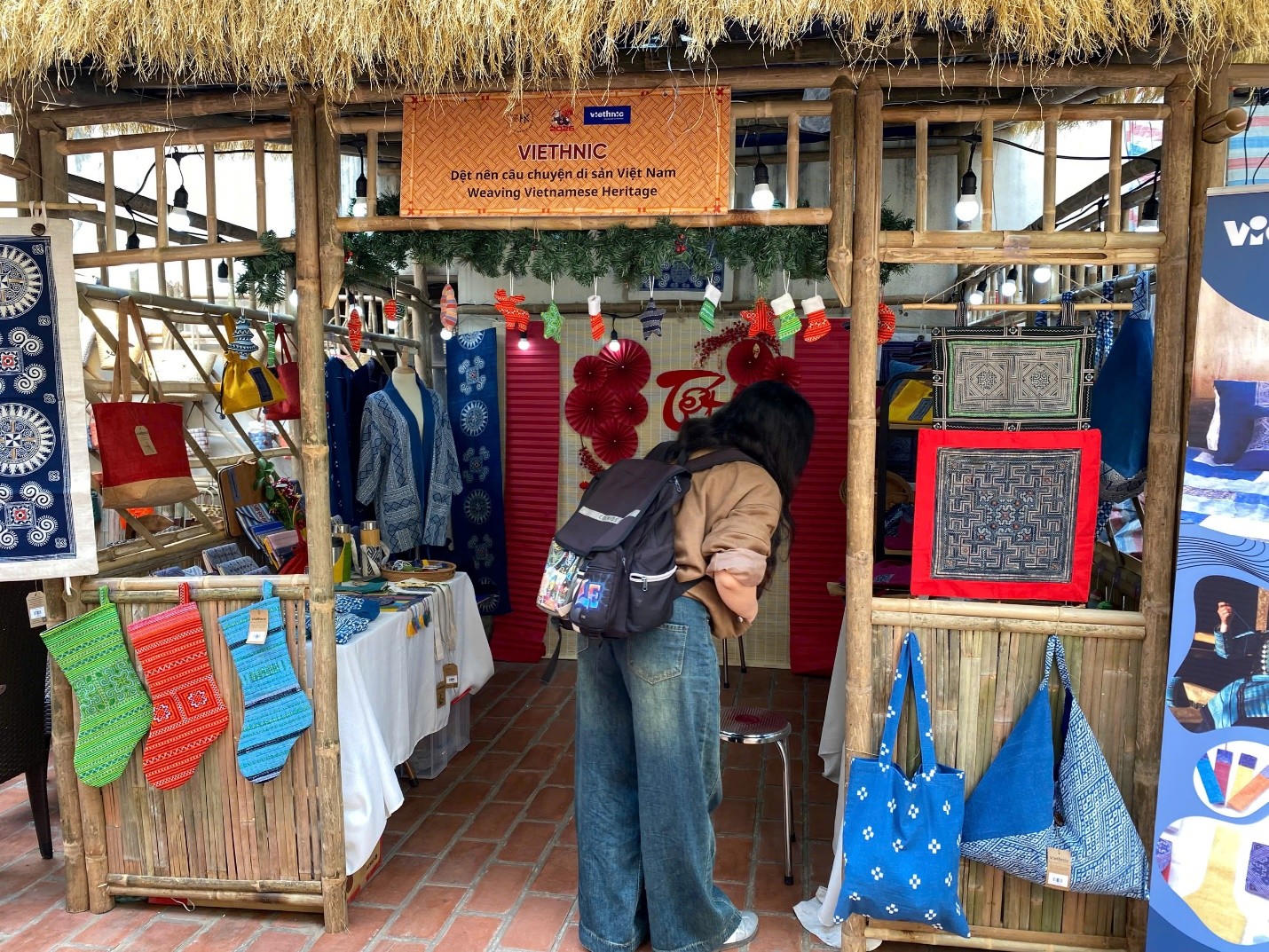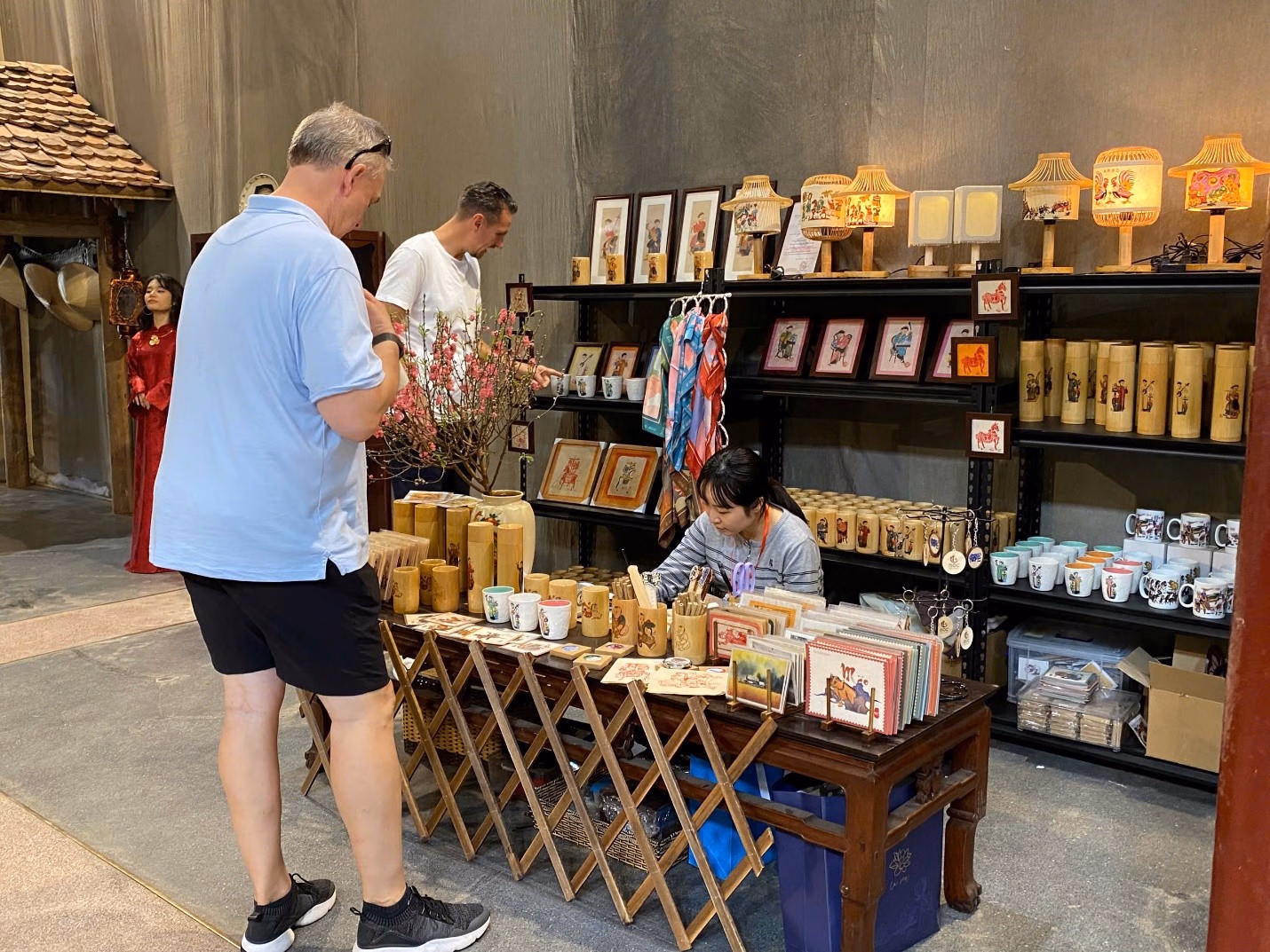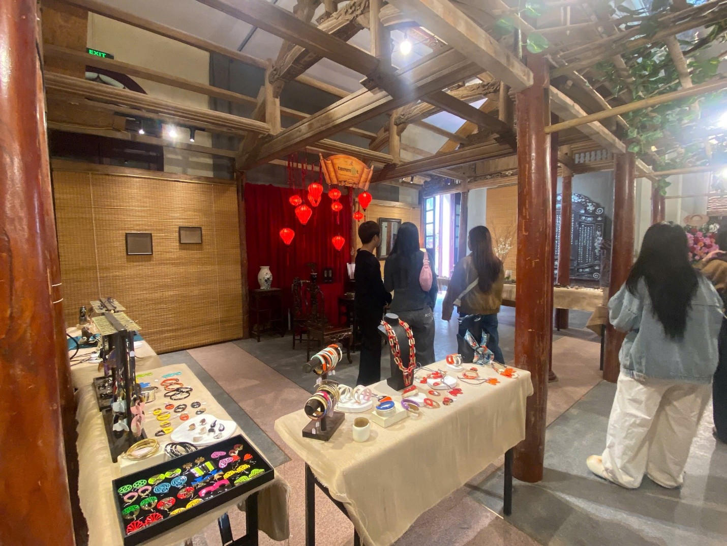 Không gian hội quán cổ được bài trí tựa như một phiên chợ Tết thu nhỏ, nơi quy tụ những sản phẩm mỹ nghệ tinh xảo từ các làng nghề danh tiếng và các đơn vị tâm huyết với việc phục dựng di sản. Khách tham quan, đặc biệt là các bạn trẻ và du khách nước ngoài, tỏ ra vô cùng thích thú khi được tận mắt chứng kiến những món đồ thủ công độc bản hay tìm hiểu về phong tục Tết của người dân Bắc Bộ xưa.