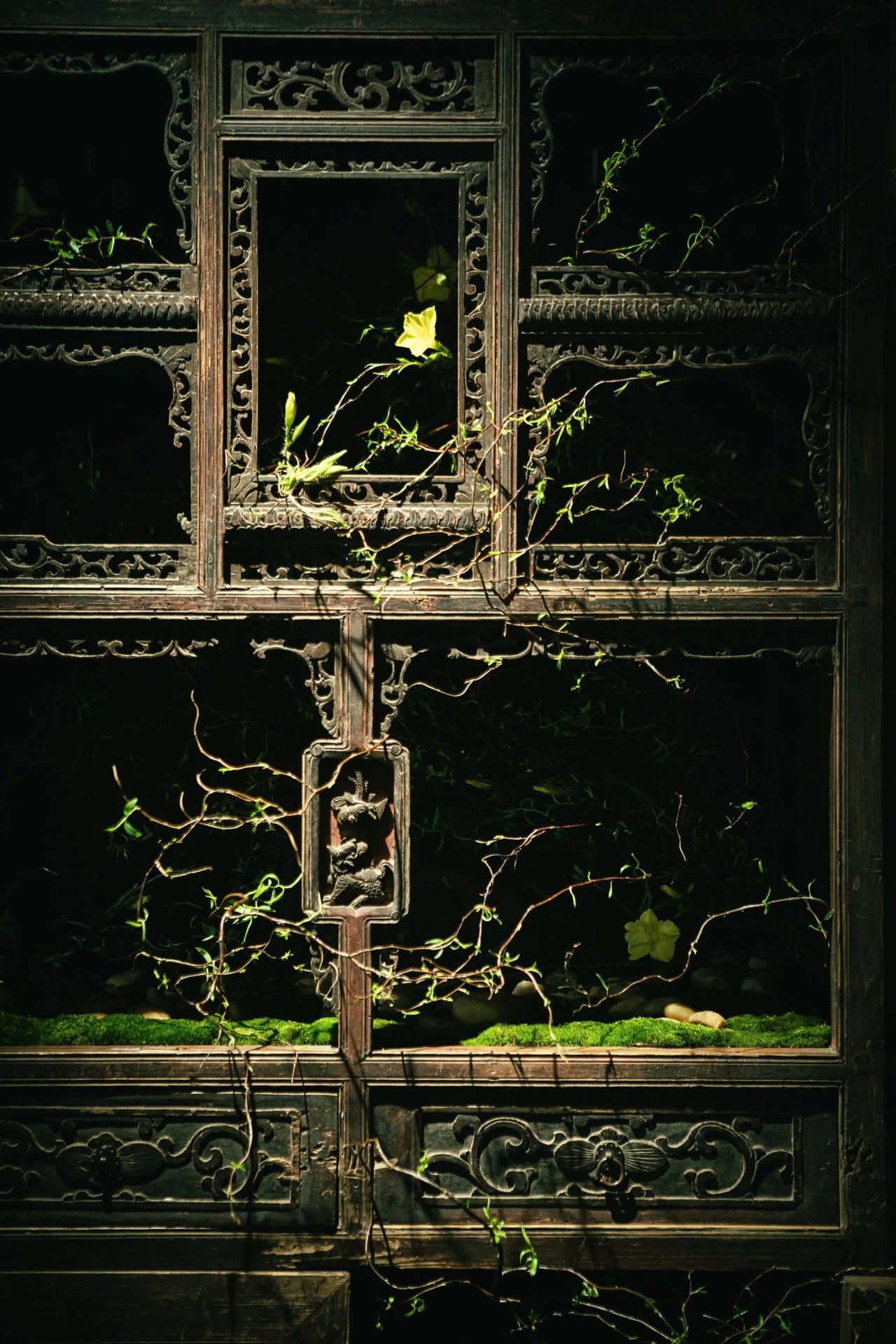 Hướng sang một tác phẩm khác cũng trong căn phòng, chị chia sẻ: Chiếc tủ gỗ cổ này có tuổi đời khoảng 200 năm rồi, nó đã mang màu sắc hương vị của thời gian, nhưng trong cái sự ẩm mốc, cũ kĩ, già nua đó lại có những mầm non mới, những sinh mệnh dồi dào sức sống đang chen mình vươn lên thể hiện sự đối lập giữa cái mới và cái cũ, sự già đi và mầm non đang trưởng thành, nó là vòng tuần hoàn nhưng cũng chính là sự tương hỗ, bổ trợ cho nhau.