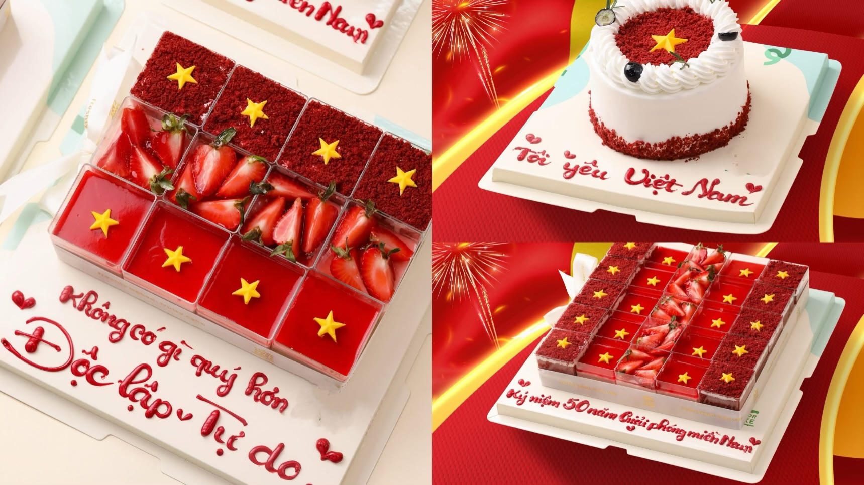 Lấy cảm hứng từ hình ảnh lá cờ đỏ sao vàng, một chuỗi cửa hàng bánh kem khác tại Hà Nội cũng cho ra mắt set bánh cờ đỏ sao vàng vô cùng đẹp mắt và ấn tượng. Phía cửa hàng này cho biết: "Đây không chỉ là một chiếc bánh đơn thuần, mà còn là lời tri ân dành cho những người đã xây nên nền hòa bình hôm nay, là lời nhắc nhở ý nghĩa cho thế hệ bây giờ để cùng nhau ghi nhớ, trân trọng, và tiếp nối những gì cha ông đã gầy dựng.