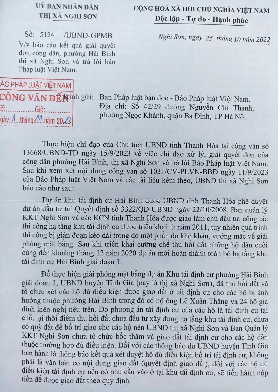 Tại Văn bản 5124/UBND-GPMB của UBND TX Nghi Sơn gửi Báo PLVN, cho biết: Để thực hiện GPMB dự án Khu TĐC phường Hải Bình giai đoạn 1, UBND Tĩnh Gia đã thu hồi đất và tổ chức xét các hộ đủ điều kiện được giao đất ở TĐC cho các hộ bị ảnh hưởng thuộc phường Hải Bình.