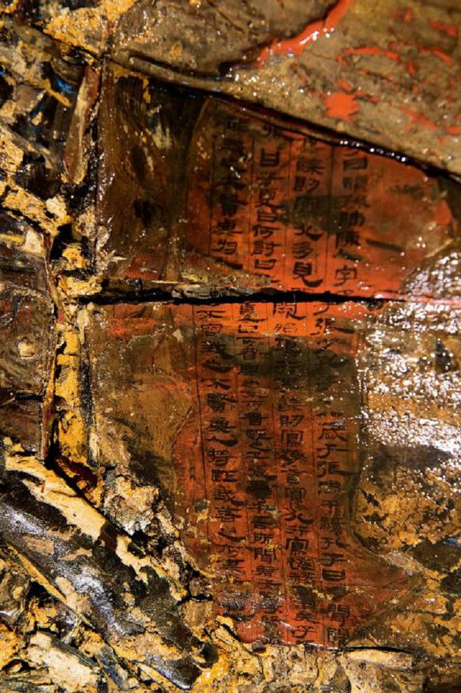 Khi lau sạch những mảnh bùn bám trên bề mặt, màn hình đã lộ rõ những con chữ trích từ sách Luận Ngữ của Khổng Tử. Đây là văn bản sớm nhất của Khổng Tử còn tồn tại, kỷ lục trước đó là một bức bích họa hang động tìm thấy ở ngôi mộ đời Đông Hán ở Đông Bình (Thái An, Trung Quốc).