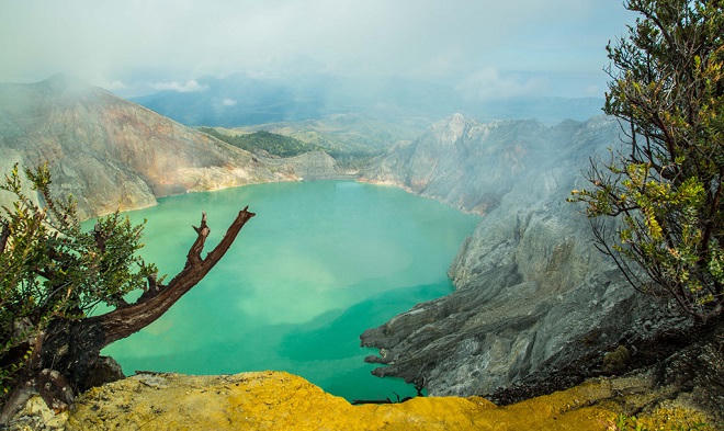 Hàng ngày, có hàng trăm du khách leo lên núi lửa Ijen để xem ngọn lửa xanh phát ra từ mỏ quặng lưu huỳnh, ngắm bình minh từ từ xuất hiện giữa làn sương mờ đặc, và đắm chìm trong màu xanh ngọc bích huyền ảo của hồ nước axit nằm lọt thỏm trong miệng núi.