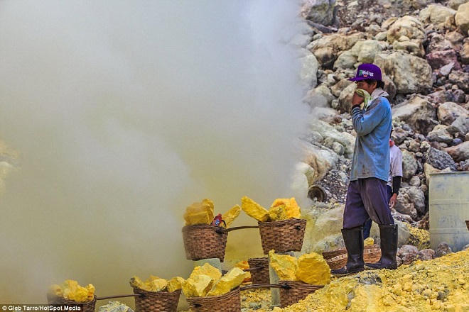 Ông Suwono, 33 tuổi, cho biết phải đi khai thác 4 lần một tuần, bắt đầu từ 6h sáng đến 14h30 chiều, để có tiền hỗ trợ gia đình. Do sức khỏe có hạn nên ông chỉ có thể mang theo 70kg lưu huỳnh trên giỏ sau lưng, và sau đó trở lại tuyến đường hiểm trở để xuống chân núi báo cáo số lượng với quản lý mỏ. Sau hai chuyến đi, ông được viên quản lý trả cho 11 USD. Nhưng cái giá mà ông Suwono phải trả còn đắt hơn nhiều: ông bị lệch cột sống.
