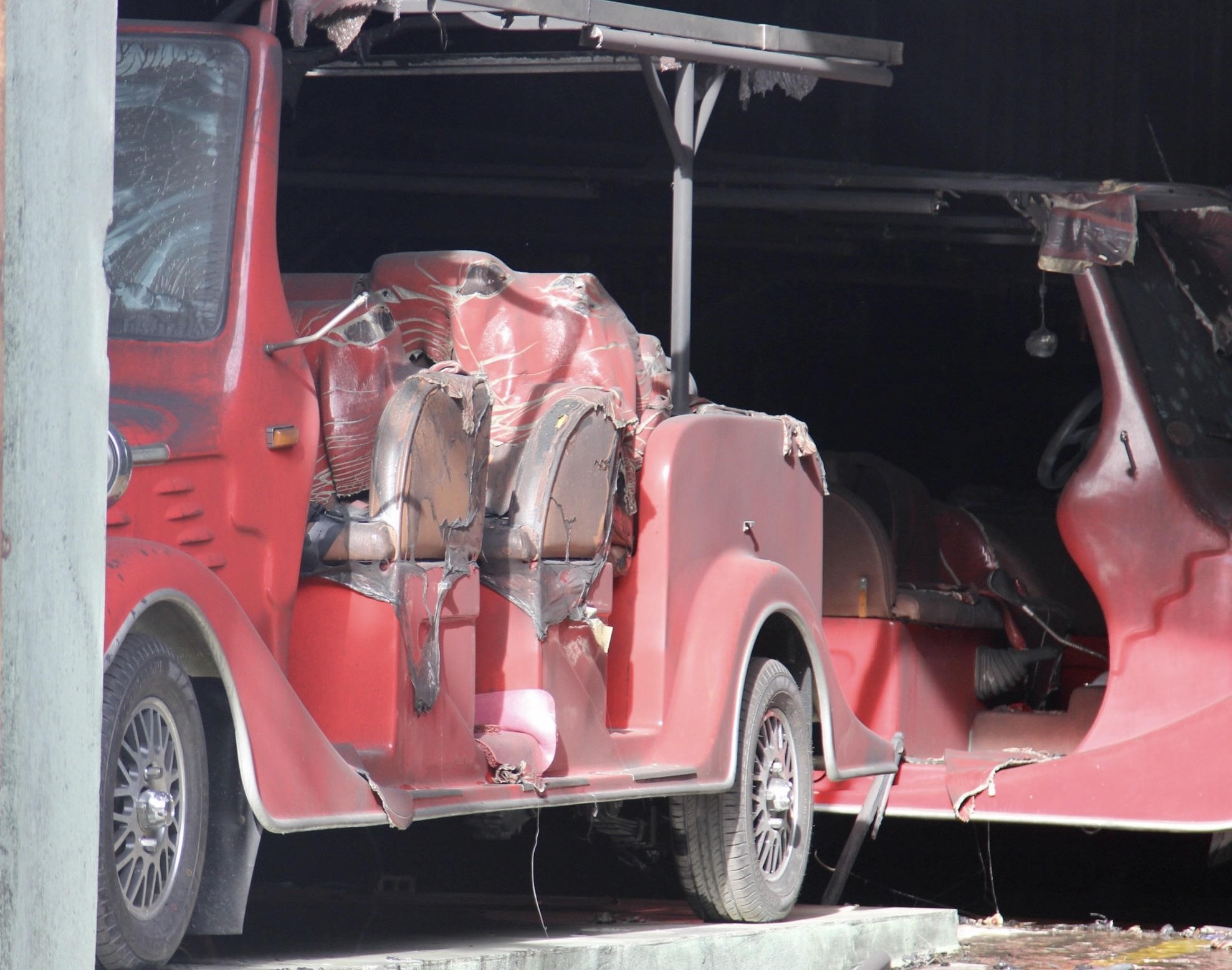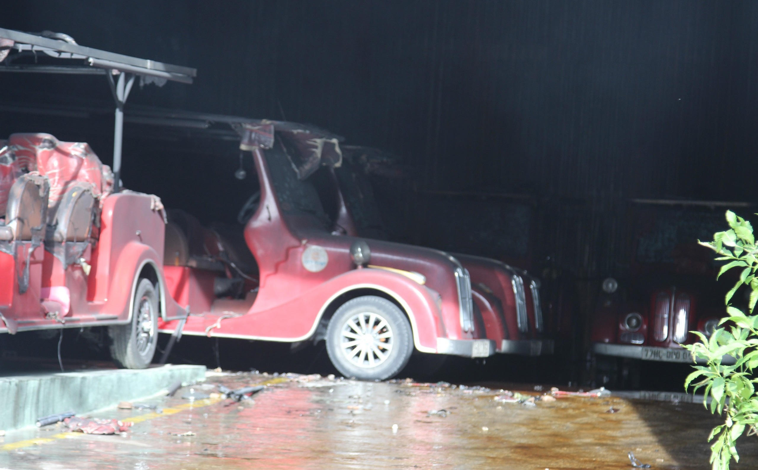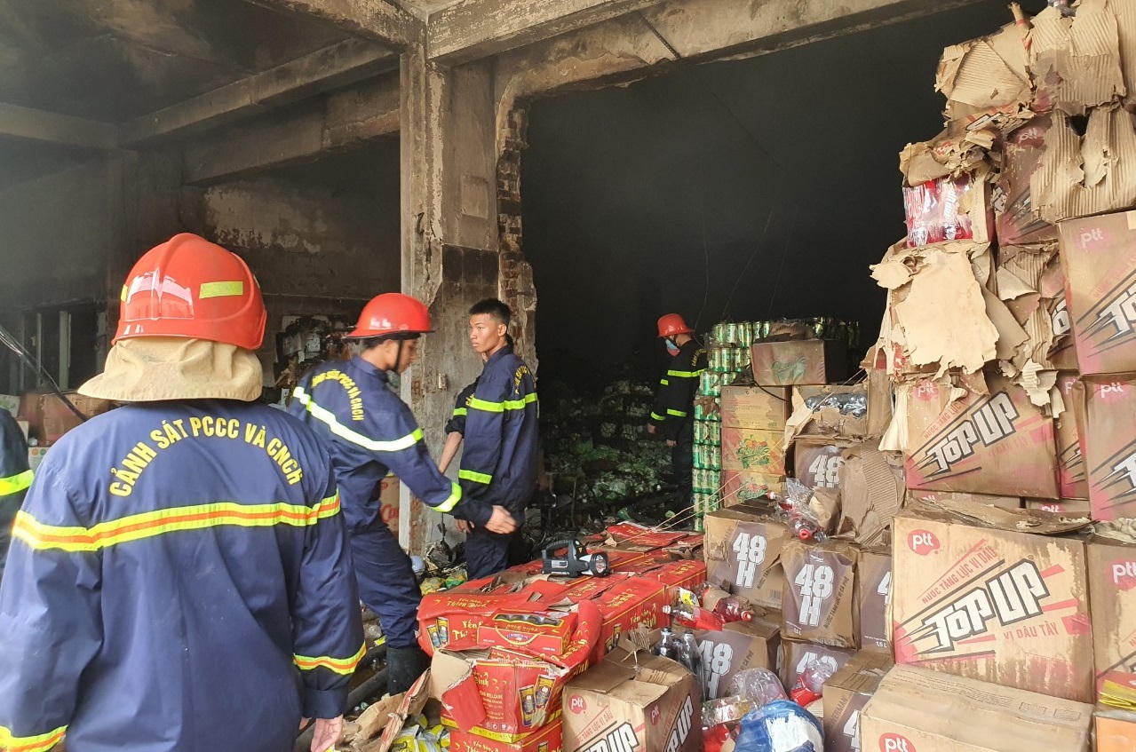Tại hiện trường cho thấy, rất nhiều nhu yếu phẩm cùng các thùng đựng các loại nước ngọt bị cháy biến dạng. Hàng chục xe điện 4 bánh cũng hư hỏng nặng.