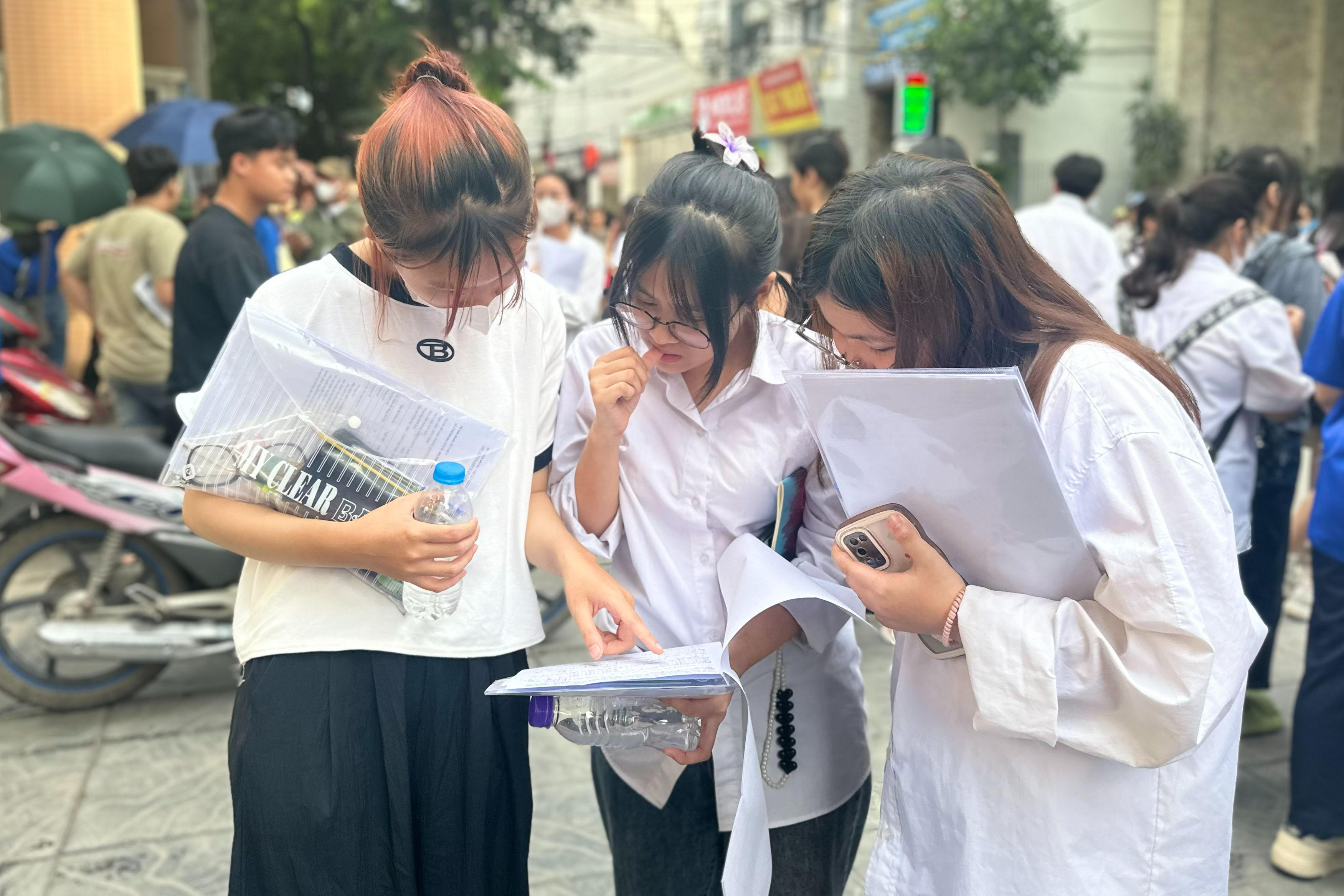 Yến Ngọc (đứng giữa) và bạn trao đổi đáp án sau khi kết thúc môn thi. |