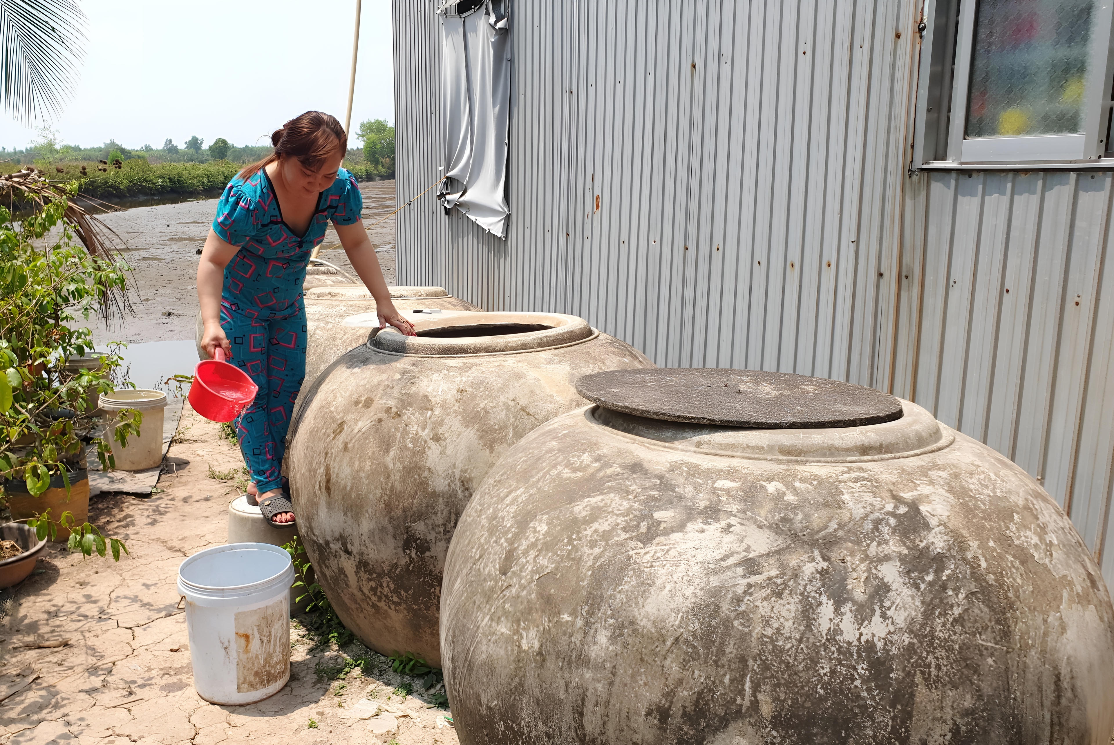 Nhiều hộ dân địa phương dựa vào nguồn nước mưa trữ lại để dùng dần, không thể khoan giếng nước ngầm được do nước bị phèn và mặn.