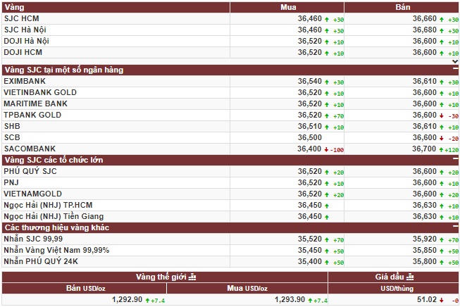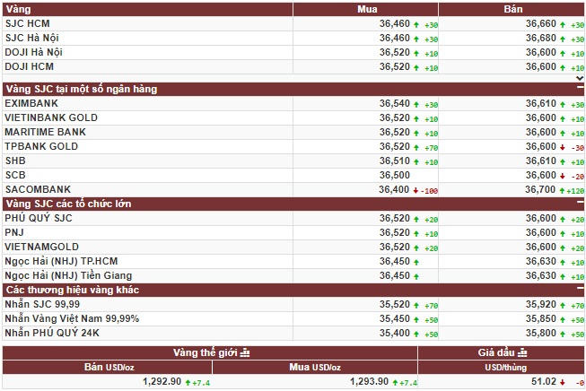 Công ty vàng bạc đá quý Sài Gòn niêm yết giá vàng SJC ở mức 36,46 triệu đồng/lượng (mua vào) và 36,68 triệu đồng/lượng (bán ra), tăng 30 ngàn đồng/lượng ở cả 2 chiều mua vào và bán ra so với cuối giờ chiều ngày 11/10