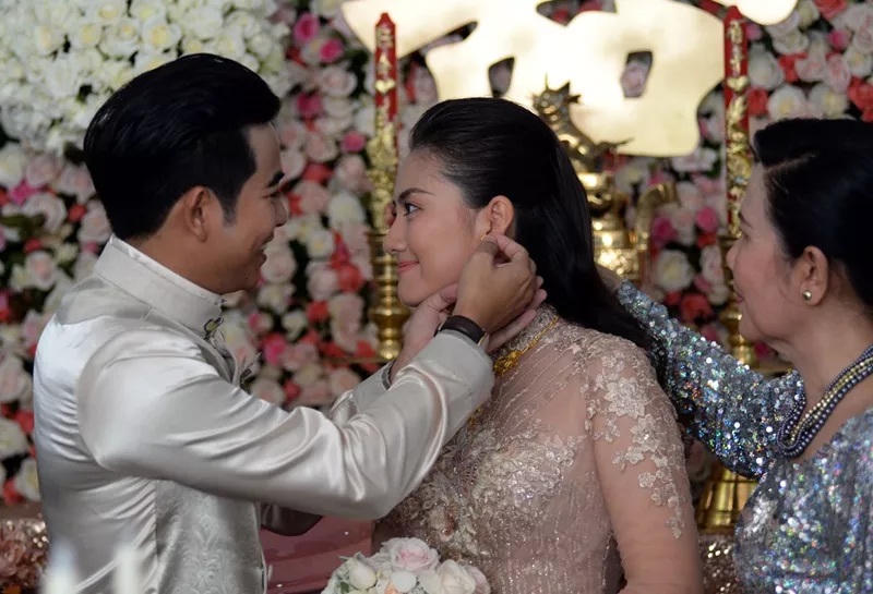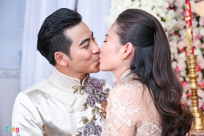 Trước gia đình hai họ, cặp diễn viên trao nhau nụ hôn say đắm.